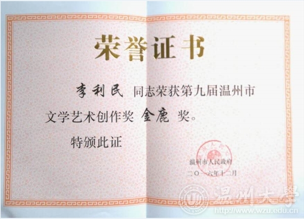 2016年12月29日下午,由温州市人民政府主办,温州市文学艺术界联合会承办的第九届温州市文学艺术创作奖颁奖典礼在温州市工人文化宫成功举办。皇冠博彩-博彩导航 李利民老师荣获金鹿奖,该奖项是温州市政府设立的文艺最高奖,每三年评选一次,温州市委常委、宣传部长胡剑谨,温州市副市长郑朝阳出席颁奖典礼并给金鹿奖获得者颁奖。