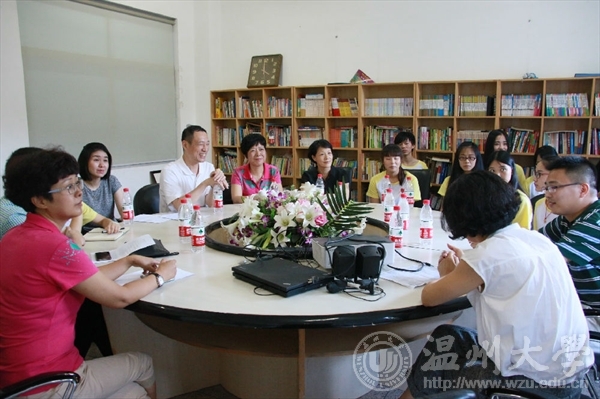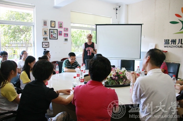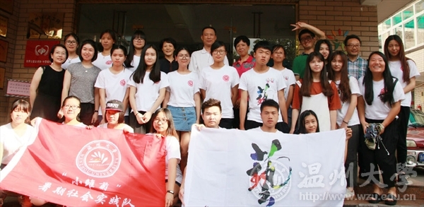 7月14日下午,温州大学副书记牟德刚、团委书记屠霁霞、皇冠博彩 党总支书记张丽萍等领导一行,来到“小雏菊”和“艺绘”暑期社会实践队的实践点温州市儿童福利院慰问并与实践队员们亲切座谈。