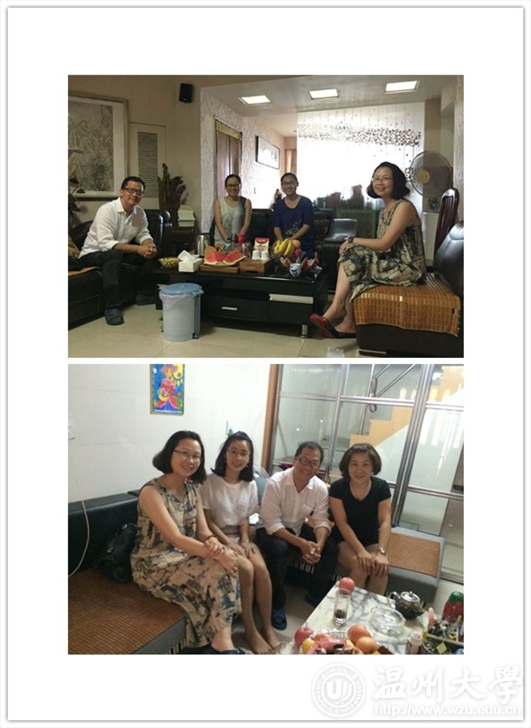 7月17日,学院党总支副书记杨振海携14美本师范班班主任陈菽现老师赴瑞安王昱人、胡淳雅同学家中家访,家访活动得到学生及其家长的热情欢迎。杨书记一行首先来到王昱人同学家中,该学生是这个班的班长,父母均是中学教师,母亲画得一手好画,家中富有浓浓的书香气息,交流中得知其父母都是原温州师范学院的校友,自然对学校有一种特殊的亲切感,老师与家长之间的交流非常融洽温馨。在交流中我们也了解到学生平时在生活中是个懂事孝顺的孩子,会主动与父母探讨交流学习方面的心得,父母与孩子在家庭中会像朋友一样交流与沟通。本次家访交流主要围绕学生的学业规划、考研深造与就业问题展开深入讨论,我们建议并鼓励学生要根据自身的职业生涯规划制定发展方向与具体目标,合理安排时间,学好专业知识,提升各方面素质与能力,无论是考研深造还是工作就业两者并不矛盾,应该可以相辅相成,互相促进的。随后杨书记一行来到胡淳雅同学家中,学生与其母亲接待了老师一行,交流中其母亲一再夸奖孩子非常懂事、生活自立、社会适应与交往能力强,从小到大都不用父母为其操心,在学习与生活上均有自己明确的理想与目标,能够主动合理的安排时间与精力去追求。该学生绘画专业基础好,在暑期除了安排自身专业学习之外也主动参与社会兼职锻炼,以便为今后的顺利就业打下更好的基础。交流中我们也鼓励学生在假期参与社会锻炼,但要注意防暑与人身安全。