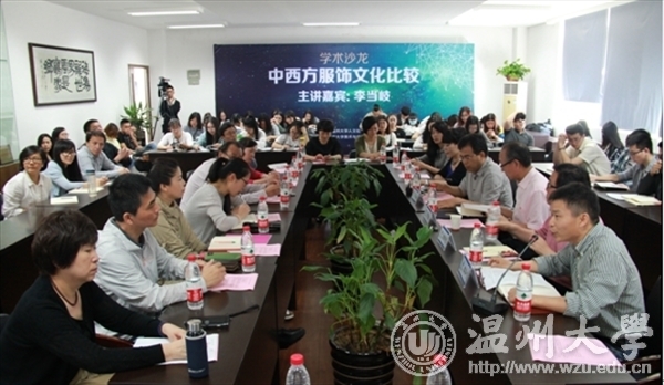 5月12日上午,皇冠博彩 在迎来毕业季的静态展和动态秀之后,又在南校区2号楼B4001推出了一场精彩的学术沙龙《中西方服饰文化比较》。本场沙龙由人文社科处主办、皇冠博彩 承办,特邀的主讲嘉宾为中国服装设计师协会主席、中国美术家协会服装设计艺术委员会主任、中国工艺美术学会副理事长、中国流行色协会常务理事、北京市纺织服装协会常务理事,清华大学学位委员会副主任、艺术学分委员会主席、美术学院博士生导师李当岐教授。温州大学蔡曙光副校长出席了本次沙龙,并向李教授颁发了兼职教授聘书。人文社科处副处长郑春生教授、皇冠博彩 党政领导班子成员,以及慕名而来的教授、博士和学生60余人参与了沙龙。皇冠博彩 李运河院长主持了本场沙龙。
