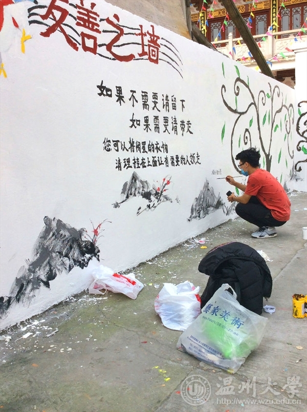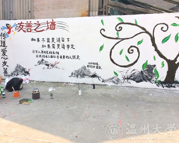 为了响应与落实市委“新青年下乡”主题精神,2016年3月26日早上八点,在皇冠博彩 青协的带领下,来自皇冠博彩-博彩导航 的志愿者们前往到乐清城东街道后所村老人亭,进行了为期一天的墙绘活动。本次“新青年下乡”墙绘活动,以“弘扬雷锋精神,传递爱心友善”为主题,呼吁人们将自己的旧衣物捐给有需要的人们。这不仅是一次物质上的贡献,更多的是精神上的支持与帮助。志愿者们通过画笔和色彩,将自己想要传达的信念幻化成一颗颗正在茁壮成长的绿树,希望“雷锋精神”这一理念像这茁壮成长的绿树一样,青春常在,精神永驻。我们本次的墙绘活动一方面主要是运用专业知识与技能去服务社会,向社会宣传大学生们所理解的“雷锋精神”,呼吁社会弘扬“雷锋精神”,真正做到专业与实践相结合,使我们融入到社会中去,为社会奉献出自己的一份力量;另一方面,不仅让我们有机会了解农村、服务农村,还让我们在基层学到了许多平时难以不到的知识技能。 文:林依如图:林依如