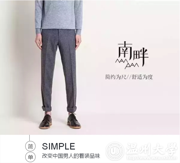 衣服成为人们生活的必需品。如今服装店充斥着商场、步行街的任意角落,但是办公室男人的服装却是千篇一律的西服西裤。在追求个性的当下,男装也向着多元化走去,办公室男装也可以与众不同。今天,美院小编为大家推荐一家可以根据自己需求而量身定做的服装店——“南畔服饰”。 1、团队构成 南畔服饰是由温州大学美院同学:叶海勇,郭胜男,丁凯迪三位共同努力的结果。并邀请了原东蒙集团精品西服部主管——牛广强先生作为产品顾问;还有天猫黄金台诊断师——李孟先生为运营顾问。南畔服饰产业链严谨,从人才中心、产品开发设计、供应链管理到最后的淘宝运营,各环节分工合理,成员都能在最好的位置完成最好的工作。当然少不了指导老师徐慧娟老师的指路。2、品牌理念 南畔是一家专为办公室男性打造时尚生活的品牌。创世之初至今一直坚持“简约为尺,舒适为度”的核心理念。团队从产品的设计研发到销售,都坚持在品质上做到一线,每一件产品都有一线的产品版型,一线的产品工艺和最舒适简约的设计。3、品牌设计4、创业感言 原创男装设计,打造有格调的办公室形象,并通过各大电商网站,推广产品,让南畔改变中国男装品味。南畔的创业感言是:创业不仅仅为了赚钱,更多的是可以改变社会和世界,向大家展示自己的看法。 编辑:沈铮涛 徐昕