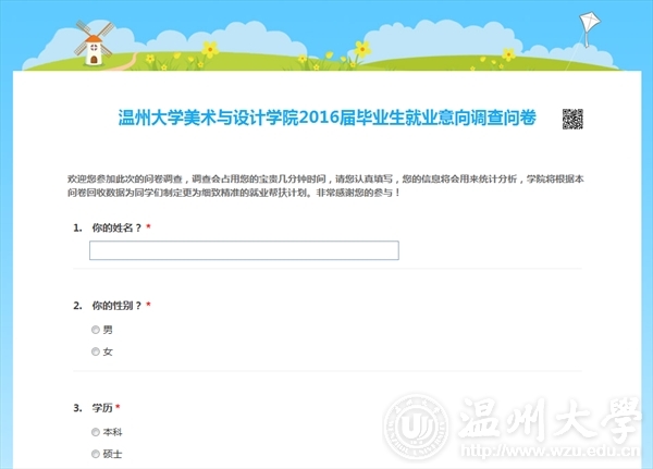 温州大学美术于设计学院关于做好2016届毕业生就业意向调查问卷的通知 各班级: 为了深入地了解2016届毕业生的就业意向,帮助毕业生有的放矢地进行求职定位,提高毕业生就业工作的实效性,决定在2016届毕业生中开展就业意向调查工作,现将有关事项通知如下: 1.组织2016届毕业生认真填写《皇冠博彩-博彩导航 2016届毕业生就业意向调查问卷》,此问卷作为确定毕业生本人就业意向的依据,同时也作为向用人单位进行分类推荐的依据。 2.请各班级毕业生通过网页、微信填写好的就业意向调查表并提交。问卷链接://www.sojump.com/jq/5900766.aspx 3.学院将根据本问卷回收数据为同学们制定更为细致精准的就业、创业帮扶计划,更好的为2016届毕业生做好就业指导和服务。 附1:皇冠博彩-博彩导航 2016届毕业生就业意向调查问卷 皇冠博彩-博彩导航 学生科 2014年10月16日
