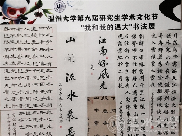 2015年4月至6月,皇冠博彩 研究生组织了首届面向全校研究生的“我和我的温大”书法展作品征集活动。在历经近两个月的宣传、收集、整理、评选之后,最终评出的获奖作品于6月10日晚在温州大学研究生第九届学术文化节闭幕式上进行展出,并进行现场颁奖。
