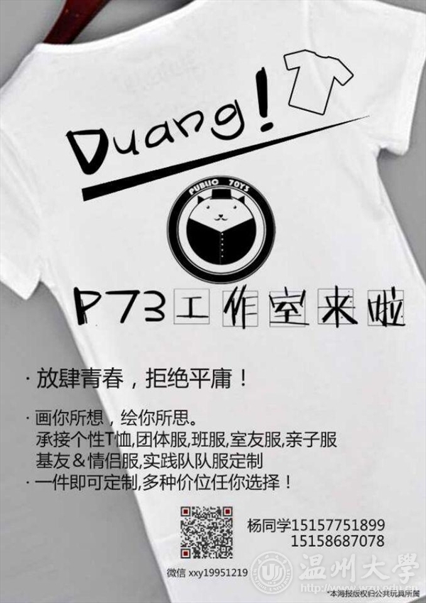“创客”一词来源于英文单词"Maker”,是指出于兴趣与爱好,努力把各种创意转变为现实的人。他们热衷于创意、设计、制造,最有意愿、活力、热情和能力在创新2.0时代为自己、为全体人类去创建一种更美好的生活。 创客中有一个特殊的群体,那就是“艺·创客”,他们是一群充分发挥自己的艺术细胞和设计灵感,运用自己的扎实的专业知识,努力把各种创意变为现实,带进生活的人。我们大美院中就有这样一批人的存在!一、 团队名称P73服装设计 二、 工作室简介 P73服装品牌,建立于2014年4月,核心团队5人,设计人员辐射温大服装系。品牌针对16-28岁人群,现以原创图案和百搭基本款为主,来表现一种既想表达自己个性又想衣服百搭方便,穿出自己风格的人群。现团队以原创设计T恤和卫衣为主,并且承接各类团体服,实践队服的设计制作。 销售方式以网店运营为主,推广方式以微博,微信公共平台为主。目标将来成为设计销售为一体,工厂代加工,线上线下结合的大众百搭品牌。三、 团队组成 杨兴 (13服设2班) 董敏婕 (13服设2班) 李东婷 (13环艺) 张焕强 (13服设2班) 梁杰 (13商务英语 城院)四、 作品展示 五、 创业领域 图案T恤设计销售 个人图案T恤定制 班服,团体服,实践队服 原创帆布袋子 同学们可以为自己设计衣服图案,或把自己课堂上的设计变为实物,自己穿。P73也可以为同学们代卖,并以P73·某某某的方式署名,将自己的设计投放市场。 六、 创业感言 我们大学生在进行创业时,建议结合所学专业,利用专业知识选择创业方向,并应该注意以下几点: ● 创业要以适度创新为原则,结合市场动态; ● 充分利用和结合自身或团队成员的专业知识; ● 注意保证团队的感情融洽,工作分工明确。 地址:温州大学创业园A12号负责人:杨兴(15157751899/641899)供稿:P73服装设计工作室本版编辑:张昇终审:李艳燕