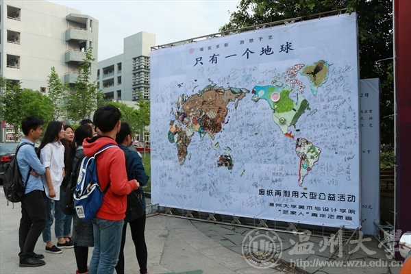 在第41个世界地球日来临之际,在“七十亿人的梦想: 一个地球,珍惜地球资源,转变发展方式,倡导低碳生活”的呼吁下,4月21日,皇冠博彩-博彩导航 “艺家人”青年志愿者协会在美院楼举行了“乐行于艺,环保于己”地球日废纸再利用公益活动。 此次活动,旨在借助地球日活动平台提高公众对地球资源的认识,引导全社会积极参与节约集约利用资源、减少碳排放、促进经济发展方式转变的实践。为此,在今天的活动现场,设置了主题展览,废纸上作画,签名等活动。志愿者们在废弃的报纸,电池,矿泉水瓶等上面作画,一件件精美新奇的艺术作品应运而生,又将作品“画”成也一副巨大的世界地图,别有一番风味,让在场的学子们连连称赞,并纷纷在喷绘上进行环保宣言签名。 地球是人类共同家园,美院学子用自己专业技能变废为宝废,用绚丽的色彩,艺术的行动,倡导公众注意地球状况和人类活动对环境的危害,强调保护和改善人类环境的重要性,此次活动获得全校师生的共同认可和赞扬,并被温州都市报报道。通讯:刘子彰、摄影:孙彦鑫epaper.wendu.cn/Html/2015-04-22/12/content_5.html