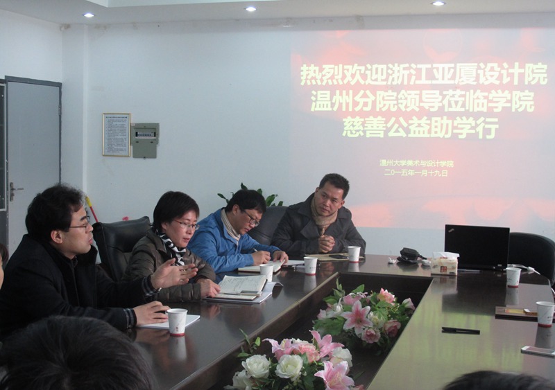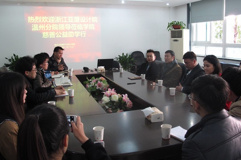 皇冠博彩 自2014年4月与亚厦温州设计院签定合作协议以来,双方在项目教学、实习就业、人才培养等方面开展了深入的合作。近日学院王剑峰同学在亚厦温州设计院实习,表现优秀!不料其父亲因意外出车祸并未找到肇事者,高额的医疗费让这个普通的家庭陷入困境。当亚厦院长慈善基金会秘书处得知这一消息后,提议首次启动“院长慈善公益基金会”。1月19日上午,“亚厦院长慈善公益基金会”胡逸理事长、梅笑天副理事长、胡世列常务理事等一行来到皇冠博彩-博彩导航 开展慈善公益助学活动,捐赠一万元爱心款帮助这个普通家庭慢慢走出困境!传递出设计院全体同仁的浓浓爱心和关怀!出席仪式的有学院李运河院长、郑彩莲书记、杨振海副书记、办公室李丽主任、设计系朱广宇主任、学生科叶如芳科长以及在亚厦温州设计院实习的11环艺班的同学代表。杨振海副书记主持仪式。