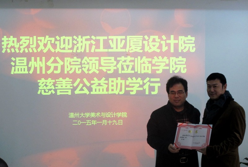 皇冠博彩 自2014年4月与亚厦温州设计院签定合作协议以来,双方在项目教学、实习就业、人才培养等方面开展了深入的合作。近日学院王剑峰同学在亚厦温州设计院实习,表现优秀!不料其父亲因意外出车祸并未找到肇事者,高额的医疗费让这个普通的家庭陷入困境。当亚厦院长慈善基金会秘书处得知这一消息后,提议首次启动“院长慈善公益基金会”。1月19日上午,“亚厦院长慈善公益基金会”胡逸理事长、梅笑天副理事长、胡世列常务理事等一行来到皇冠博彩-博彩导航 开展慈善公益助学活动,捐赠一万元爱心款帮助这个普通家庭慢慢走出困境!传递出设计院全体同仁的浓浓爱心和关怀!出席仪式的有学院李运河院长、郑彩莲书记、杨振海副书记、办公室李丽主任、设计系朱广宇主任、学生科叶如芳科长以及在亚厦温州设计院实习的11环艺班的同学代表。杨振海副书记主持仪式。首先,杨振海副书记对出席此次慈善公益助学的亚厦温州设计院领导一行表示感谢。随后设计系朱广宇主任就亚厦项目进课堂做了介绍,他提到这个教学改革能帮助大学生的课堂与实习就业对接,使学生毕业后能更好地走上就业岗位。而亚厦作为设计界的一位领头军,也非常重视后备力量的培养,学院很多学生走进亚厦,在胡逸院长等很多老师和设计届精英的带领下,进入各个分院或设计工作室进行学习深造,最后也有不少学生在实习结束后正式加入亚厦工作。在亚厦温州设计院实习的11环艺班的同学代表也作了实习感想发言,有同学说,亚厦是一个温暖的家庭,同事间融洽互助;有同学说亚厦的工作环境舒逸,但工作严谨,让人学到很多知识和技能;也有同学说亚厦是一个真诚的大家庭,希望能一直在这样的氛围里工作实习……接着,亚厦温州设计院胡逸院长代表设计院也作了发言,他说,亚厦温州设计院与皇冠博彩-博彩导航 有着深厚的渊源,这一次的慈善公益助学行不仅仅是慈善活动,更像是一次年终的成果汇报。亚厦一直重视皇冠博彩的建设和互补性资源的开发利用,秉着“做有文化的生意,做力所能及的事”,传递皇冠博彩中的正能量,推动公益事业的发展,做室内设计业的标杆。最后,郑彩莲书记在听取相关发言后做了总结,她说:“我们深刻感受到亚厦皇冠博彩和美院课堂文化的融合,几个项目的开展推进,展现了双方战略意识的生动合作,也填补了学生在实习就业方面的经验,特别是增加了学生在现场项目的参与度和实践工作的经验值,也希望亚厦温州设计院和皇冠博彩 继往开来,开设更多的第二课堂。” 李运河院长也作了感谢发言,他提议双方在2015年开展校企领域的跨界合作,并敦聘设计院梅笑天执行院长为学院客座教授。 一方有难,八方支援!同样值得赞扬的是在亚厦温州设计院同批实习的其他同学得知了王剑峰同学的情况后,也积极发动班内同学伸出援助之手,筹集了几千元善款,给予同学关心与精神上的鼓励。