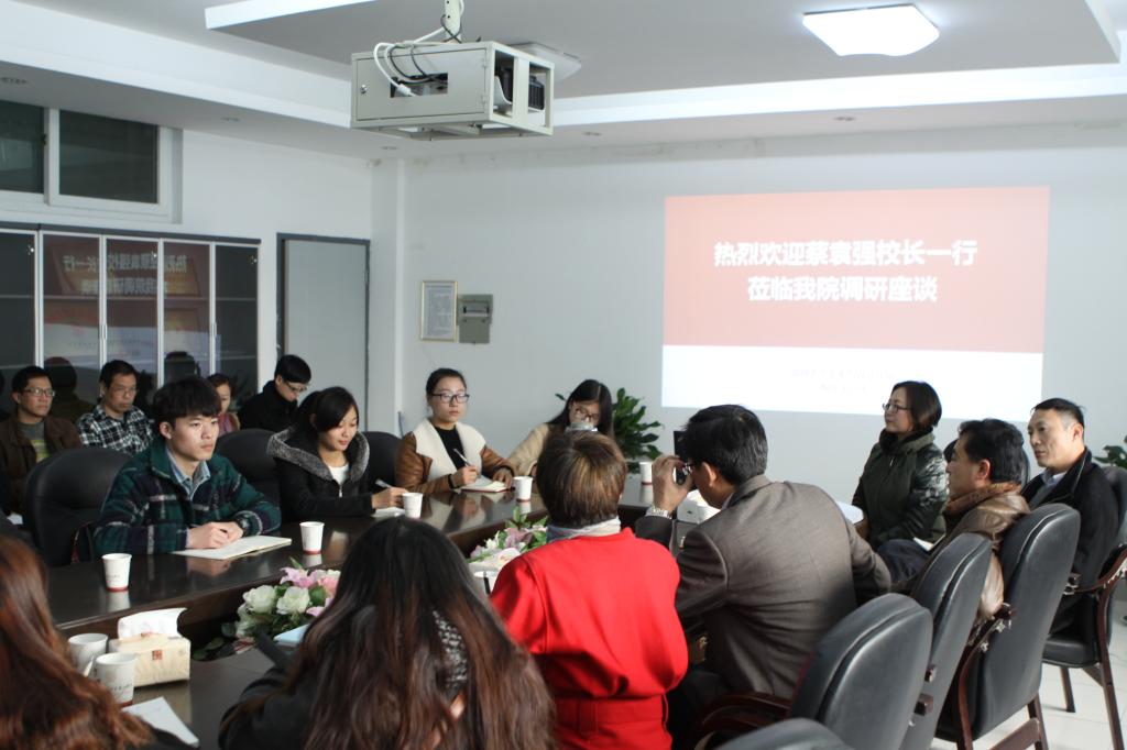 12月24日下午,蔡袁强校长一行莅临皇冠博彩 调研座谈,座谈会在南校区美术楼2B216召开。出席会议的校领导还有牟德刚副书记、薛伟副校长,党校办、教务处、人事处、学生处、就业处、教师教学发展中心等相关职能部门负责人陪同调研,参加座谈的还有皇冠博彩 班子成员、各科室负责人以及22位往届毕业生与在校生代表。座谈会主要围绕如何加强教风学风建设、提高人才培养质量与提升毕业生就业核心竞争力而展开。会议由教务处处长施晓秋主持。