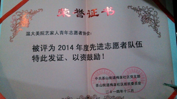 12月28日上午,梅泉社区居委会在道德讲堂开展了2014年梅泉社区志愿者表彰大会。此次大会由梅泉社区徐云龙委员主持,鲁建晓、王春宝、吴海燕等社区委员出席,皇冠博彩 “艺家人”青年志愿者协会,温州医科大学,温州大学城市学院,温州职业技术学院的志愿者参与此次表彰大会。 9点50分,志愿者表彰大会正式开始,首先是梅泉居委会为志愿者带来的一段小短片,为志愿者回顾了2014年以来的志愿者活动。丰富多彩的社区生活,快乐充实的志愿者活动......社区委员对各个志愿者团队进行颁奖,皇冠博彩 “艺家人”青年志愿者协会被评为“2014年度先进志愿者队伍”,这也是对我们“载梦小舟”支教的志愿者们这一年来辛苦付出的肯定。随后,各获奖志愿者团队代表一一上台发言,皇冠博彩 “载梦小舟”负责人代表张静同学也上台作了发言,总结“载梦小舟”这一年来的感想,对志愿者表达了由衷的感谢,对一直支持的社区负责人和家长,以及可爱的小朋友们表示感谢。最后,在梅泉社区居委会委员鲁建晓女士的演讲下,本次志愿者表彰大会圆满划上了句号。 回首皇冠博彩 “艺家人”青年志愿者协会与梅泉社区合办“载梦小舟”绘画班这几年所走过的路程,有感动,也有快乐,我们的支教活动也会一如既往地开展下去,为更多的人提供帮助,这就是志愿者的精神! (通讯/拍摄:刘子彰)