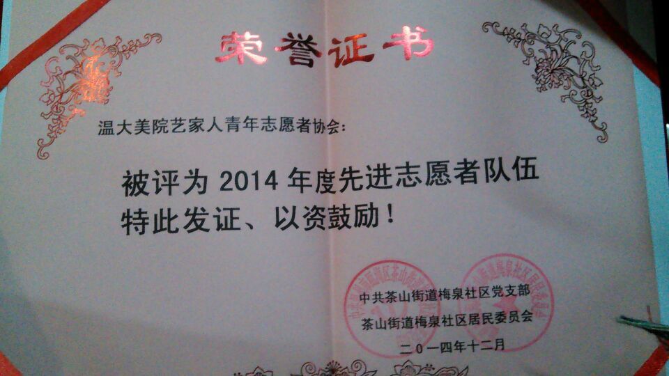 12月28日上午,梅泉社区居委会在道德讲堂开展了2014年梅泉社区志愿者表彰大会。此次大会由梅泉社区徐云龙委员主持,鲁建晓、王春宝、吴海燕等社区委员出席,皇冠博彩 “艺家人”青年志愿者协会,温州医科大学,温州大学城市学院,温州职业技术学院的志愿者参与此次表彰大会。 9点50分,志愿者表彰大会正式开始,首先是梅泉居委会为志愿者带来的一段小短片,为志愿者回顾了2014年以来的志愿者活动。丰富多彩的社区生活,快乐充实的志愿者活动......社区委员对各个志愿者团队进行颁奖,皇冠博彩 “艺家人”青年志愿者协会被评为“2014年度先进志愿者队伍”,这也是对我们“载梦小舟”支教的志愿者们这一年来辛苦付出的肯定。随后,各获奖志愿者团队代表一一上台发言,皇冠博彩 “载梦小舟”负责人代表张静同学也上台作了发言,总结“载梦小舟”这一年来的感想,对志愿者表达了由衷的感谢,对一直支持的社区负责人和家长,以及可爱的小朋友们表示感谢。最后,在梅泉社区居委会委员鲁建晓女士的演讲下,本次志愿者表彰大会圆满划上了句号。 回首皇冠博彩 “艺家人”青年志愿者协会与梅泉社区合办“载梦小舟”绘画班这几年所走过的路程,有感动,也有快乐,我们的支教活动也会一如既往地开展下去,为更多的人提供帮助,这就是志愿者的精神!(通讯/拍摄:刘子彰)