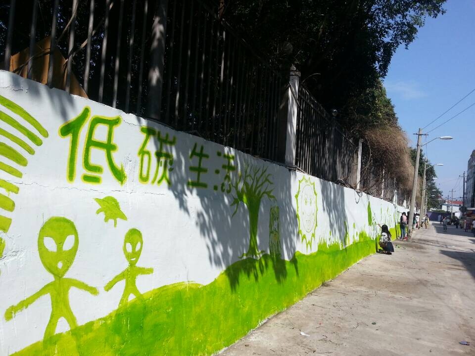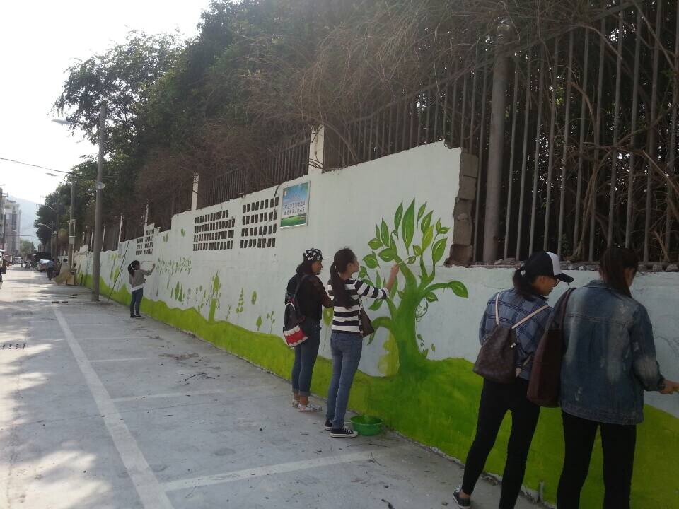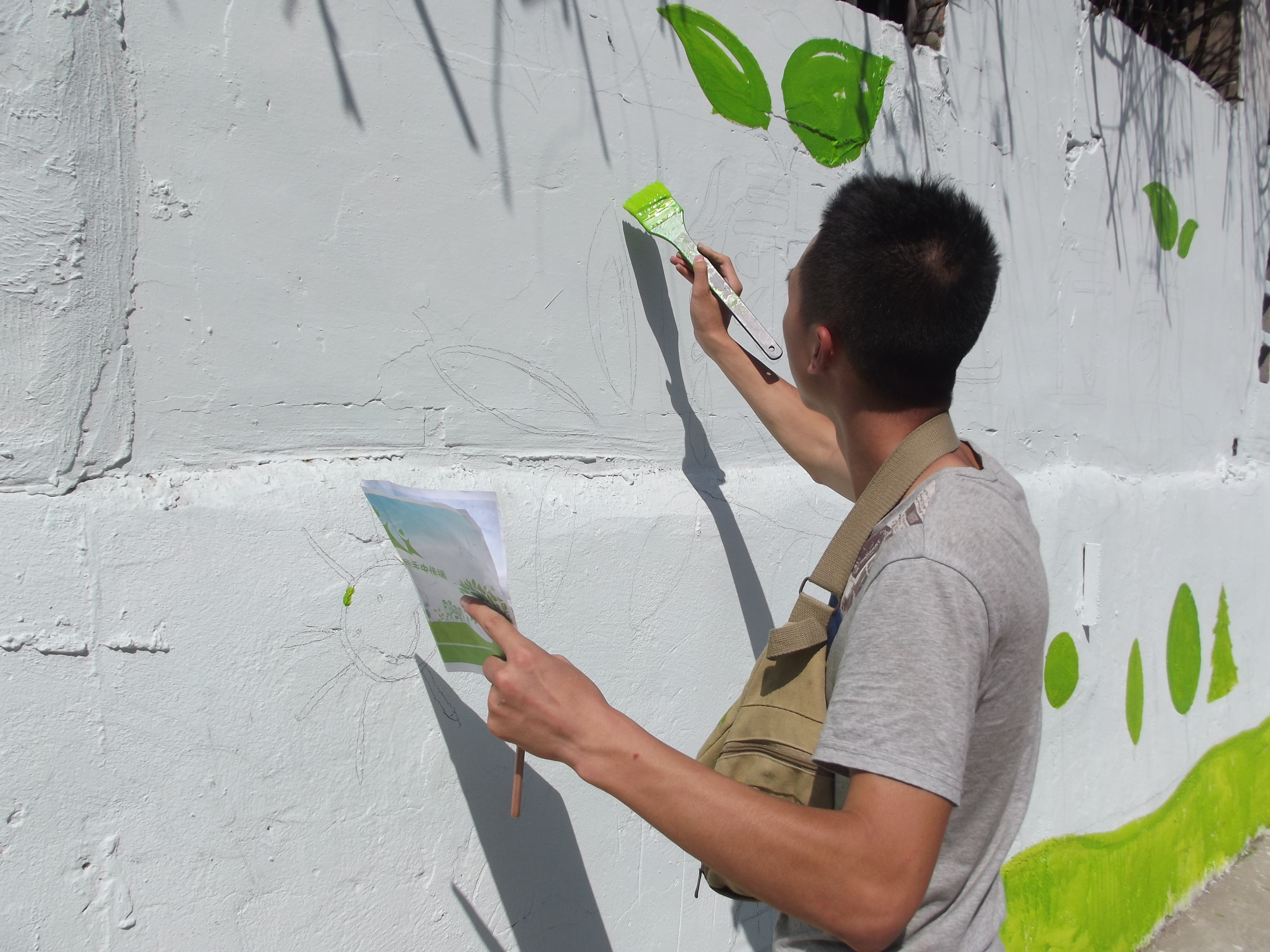 10月12日上午8点,皇冠博彩-博彩导航 “艺家人”青年志愿者协会与瓯海区茶山镇梅泉社区居委会合作举办了“创建文明城市”的墙绘活动。激情满怀的大学生志愿者们结合自身专业优势,以“创建文明城市”为主题,以绿色作为主色调,宣传低碳环保的生活理念。在志愿者的认真绘制下,白色空旷的墙壁被一幅幅美丽的图画所代替,引来附近居民一片赞叹。