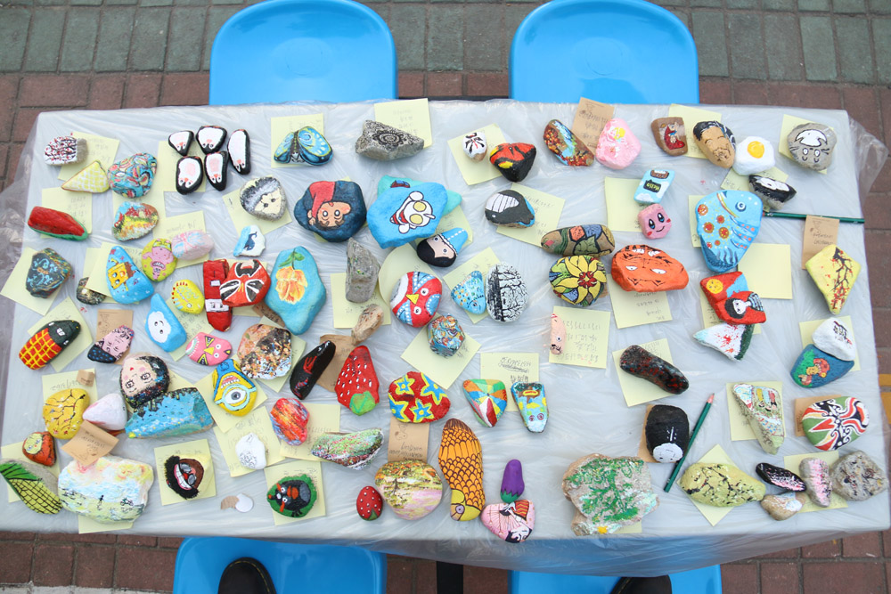 为了充分结合美术专业特长,融同学们艺术创新与健身锻炼为一体。学院团委学生会于上周末开启了“石绘心声”启动仪式,组织同学们到大罗山采集形状各异、可供绘制的石头。4月16日下午,学生会学风纪检部把从E区餐厅申请到的桌椅搬到活动场地,并将石头、画笔、画盘、颜料和水桶等各种绘画材料带至现场,引来过路学生的驻足围观,纷纷踊跃报名一展才艺。流畅的线条、斑斓的色彩加之参赛同学独特的创意,一块块普通的石头变成了精美雕琢过的艺术品。