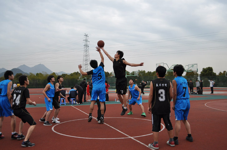 随着一声哨响,篮球对决正式开始,美院男篮拔得头筹,也许是场地的不熟悉,队友们第一节表现稍显拘谨,一个适时的暂停之后,队友们调整了作战方略,努力追赶着比分。第二节开场,我们以10比21的大比分落后,然而我们的队员不急不躁,稳住阵脚,不让对方有可趁之机,同时积极主动地进攻,突破,抢断,在几个回合的篮板争夺中占尽优势,打出了本场比赛的第一个高潮,终于在第二节结束时我们将比分追到了24比28。下半场的比赛延续了之前的精彩,队员们勇猛机智,配合默契,他们时攻时守,时缓时急,时而远投三分,时而冲抢篮下,配合默契,动作娴熟。啦啦队热情洋溢,井然有序。