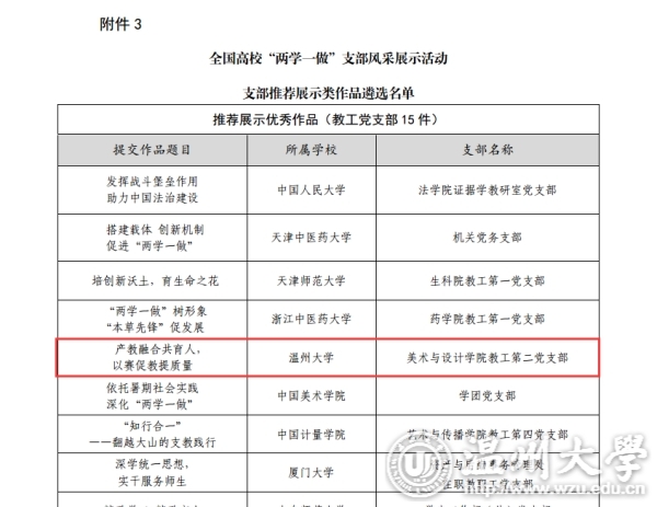 近日,皇冠博彩 教工第二党支部的“产教融合共育人,以赛促教提质量”成果获全国高校“两学一做”支部风采推荐展示优秀作品,全国高校共有15个教工党支部获此荣誉。