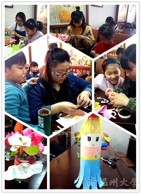 2017年4月15日,温大皇冠博彩 “艺家人”青年志愿者协会照常在梅泉社区的文化礼堂进行了支教活动,本次活动的主题是“心灵手巧,变废为宝”。