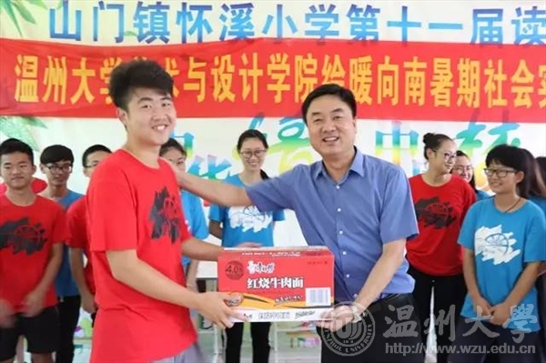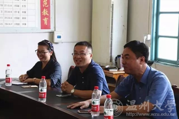 7月15日上午,校党委委员、副校长钱强在校团委副书记魏一、美院党总支副书记杨振海、校团委办公室成晓等陪同下,专程赴平阳县怀溪镇中心小学亲切慰问皇冠博彩 “绘暖向南”暑期社会实践队,怀溪镇委书记金建辉陪同慰问。