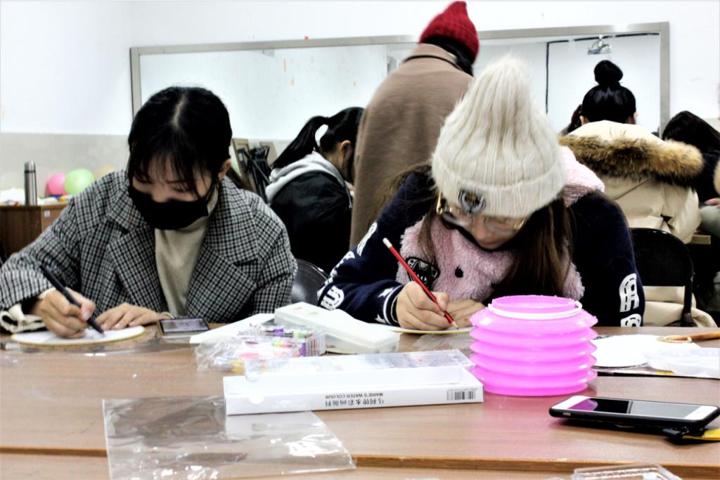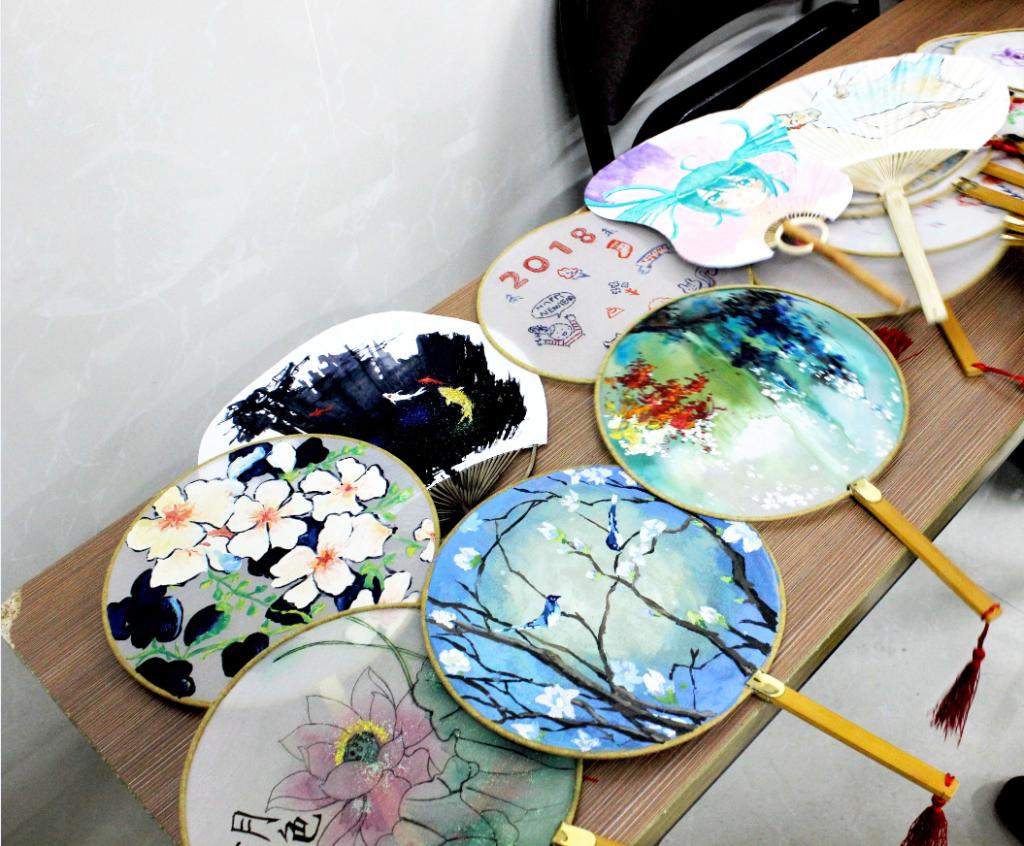 绫绢扇产于浙江省,是中国传统手工艺品之一,属于宫扇的一种,原是贵族妇女的赏玩之物,一般多圆形,故又名“团扇”,绫绢扇扇面轻如蝉翼、薄如晨雾、色泽光亮,给人以温文尔雅之感。“人生若只如初见,何处秋风悲画扇?”到了秋天,我们夏天用的扇子就被抛弃了,诗中的“画扇”指的就是绫绢扇。绫绢扇的扇面装饰包括绘画、刺绣、缂丝、抽纱、烫花、通草贴花等方式。同学们选择了刺绣和绘画两种方式分组制作,刺绣组的志愿者们一手拿针,一手捏线,将线穿过针孔,又细致地将针线穿过扇子,又调转针头,反方向再穿过一次,将线慢慢拉出,这一套动作如行云流水般流畅到位。绘画组的志愿者们也丝毫没有懈怠,一笔一画,勾勒出了一幅幅令人沉醉的画面。优秀而又独特的传统文化需要用心去感受和发扬,同学们在制作的过程中是对历史的传承,也是同传统文化的“对话”。