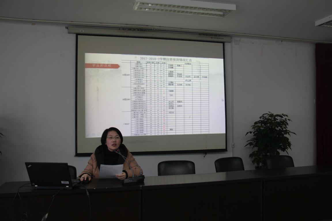学生科叶筱卉老师公布了2017-2018学年第一学习学院优秀班干部、工作积极分子名单和开学初学生返校情况,并对开学初班主任工作进行了布置:各班班主任要在第二周内召开本学期的第一次主题班会并按时上交《主题班会记录表》;班主任要深入了解并掌握学生春节期间、开学初学生的思想、学习、生活等各方面情况,积极配合学校开展开学初学生思想动态网上调查,及时发现学生存在的思想和认识问题,反馈学生反映强烈的意见和建议;新学期要营造浓郁的学习氛围,进一步加强学风建设,落实“课堂拒绝手机”制度,鼓励班级同学参加“五班十星”评比。毕业班班主任要重点关注毕业生返校和入住情况, 准确掌握未及时返校的毕业生的去向和动态,并做好在外实习安全教育工作,在外实习毕业生务必填写《温州大学毕业班学生报到注册联系单》。关于学工系统的数据维护,班主任要及时将与学生的谈话情况录入学工系统,并提醒学生在学工系统中及时更新个人联系方式等信息。