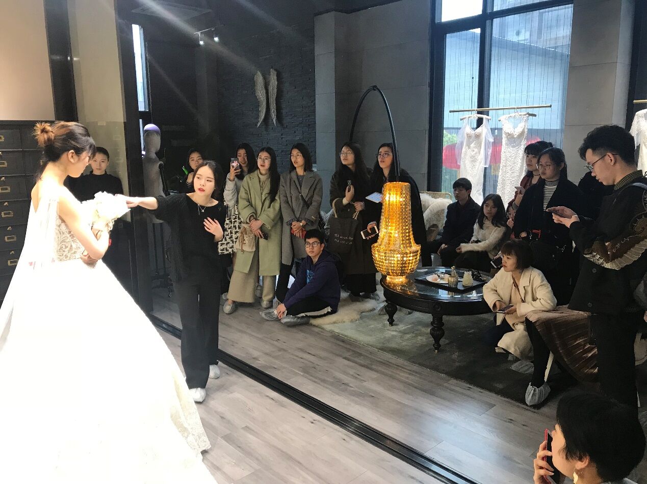 2018年3月16日,皇冠博彩-博彩导航 15级服装设计与工程班的全体同学在陈莹老师的带领下,结合礼服设计与立体造型课程,对温州嫁依工坊婚纱店进行了实地参观学习。