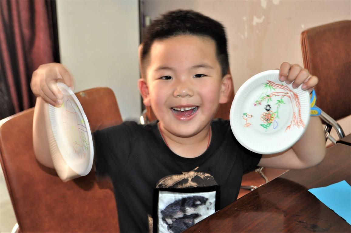 4月14日,温大美院“艺家人”青年志愿者协会的志愿者们如期来到了梅泉社区文化礼堂,开展了主题为“盘子大改造”的志愿活动。 活动刚一开始,小朋友们就按耐不住了,立刻发挥自己丰富的想象力拿起五彩画笔在盘子上作画,有的还拿起剪刀裁出小动物的剪纸图案,不一会儿,通过铅笔的构形,橡皮的修改,颜料的上色等几个步骤,再加上画出的小猫咪,大熊猫,恐龙,蜡笔小新等等五花八门的图案,以及剪出的恐龙的小翅膀,猫咪的小尾巴,大熊猫的耳朵剪纸图案,所有的元素组合在一起,一个个可爱的盘子就呈现在眼前了,使人眼前一亮!纸盘上的小动物似乎富有生命力一样,活泼可爱,摆在桌面上很是讨人喜欢!活动过程中,小朋友们还玩起了石头剪刀布的游戏,不经意间的小动作总会让大家开怀大笑。由笑声开始的活动,又将要在笑声中结束了,最后小朋友们一起拿着自己的作品合影留念。 一个个被美化装饰的纸盘托起了小朋友们美丽的心愿。单薄的纸盘,五彩的画笔,在从虚到实的过程中发展了小朋友们的观察力、记忆力、想象力和创造力,在合作、动手制作的过程中,让他们更加懂得了怎样与人沟通,如何提高交往能力。