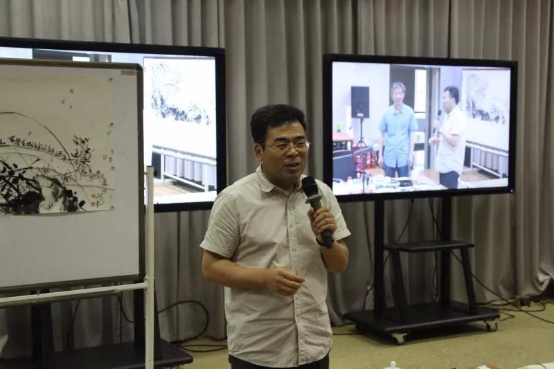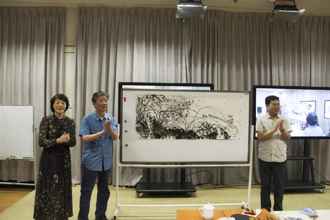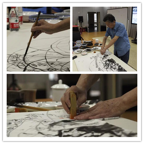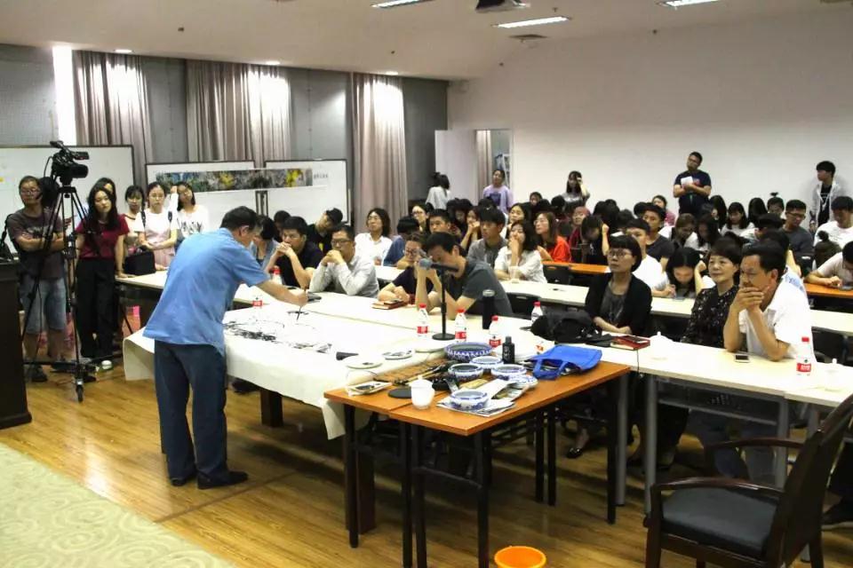 现场的水墨创作环节,在场同学们鸦雀无声,虽然没有背景音乐,却看得如痴如醉。一杯清茶侃侃而谈,娓娓道来,一支香烟运筹帷幄,激情作画。叶老师的线描长卷作品有深厚的传统功底和艺术造诣,他的泼彩花鸟画让同学们耳目一新,现场的水墨创作让同学们近距离地感受到了中国画的魅力,感受到了艺术家笔下的笔墨趣味。