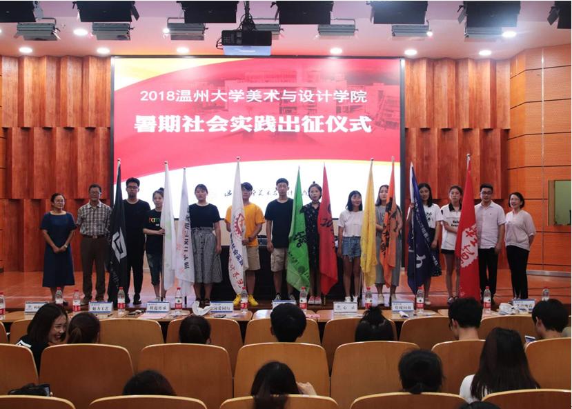 2018年7月4日下午,由美院团委学生会学术实践部举办的2018年暑期社会实践出征仪式在雁山厅隆重举行。出席此次会议的有皇冠博彩-博彩导航 党总支副书记杨振海老师,蚂蚁行动实践队指导老师许丽慧老师,艺韵晚霞实践队指导老师胡文超老师,绘暖向南实践队指导老师叶筱卉老师。 大会首先由皇冠博彩 实践负责人付秋圆同学介绍2018年实践队基本情况和实践注意事项。2018年皇冠博彩 共十支实践队,三支校级品牌提升项目,三支重点团队和四支一般团队,其中八支队伍都是美院传承了多年的队伍,当然今年也有两支全新的实践队。接下来是蚂蚁行动实践队代表发言,蚂蚁行动是成立于2014年,他们从温州前往云南迪庆藏族自治州进行支教,期间曾为当地村民解决了农产品滞销问题,进行了科普宣传和义诊,还建立了蚂蚁行动图书馆,蚂蚁行动今年也将带着这份责任,再次前往美丽的彩云之南,开始2018年暑期社会实践活动。大会第三项议程,皇冠博彩 学院党总支副书记杨振海书记讲话,杨书记提到实践队外出实践团队意识.形象意识等方面的重要性,同时也对各个实践团队寄予了期望。接下来是全体宣誓,由2018年暑期社会实践学生代表李树鹏同学领誓,全体同学宣誓。 最后杨书记为参加本次社会实践的10支队伍授旗,并集体合影留念。