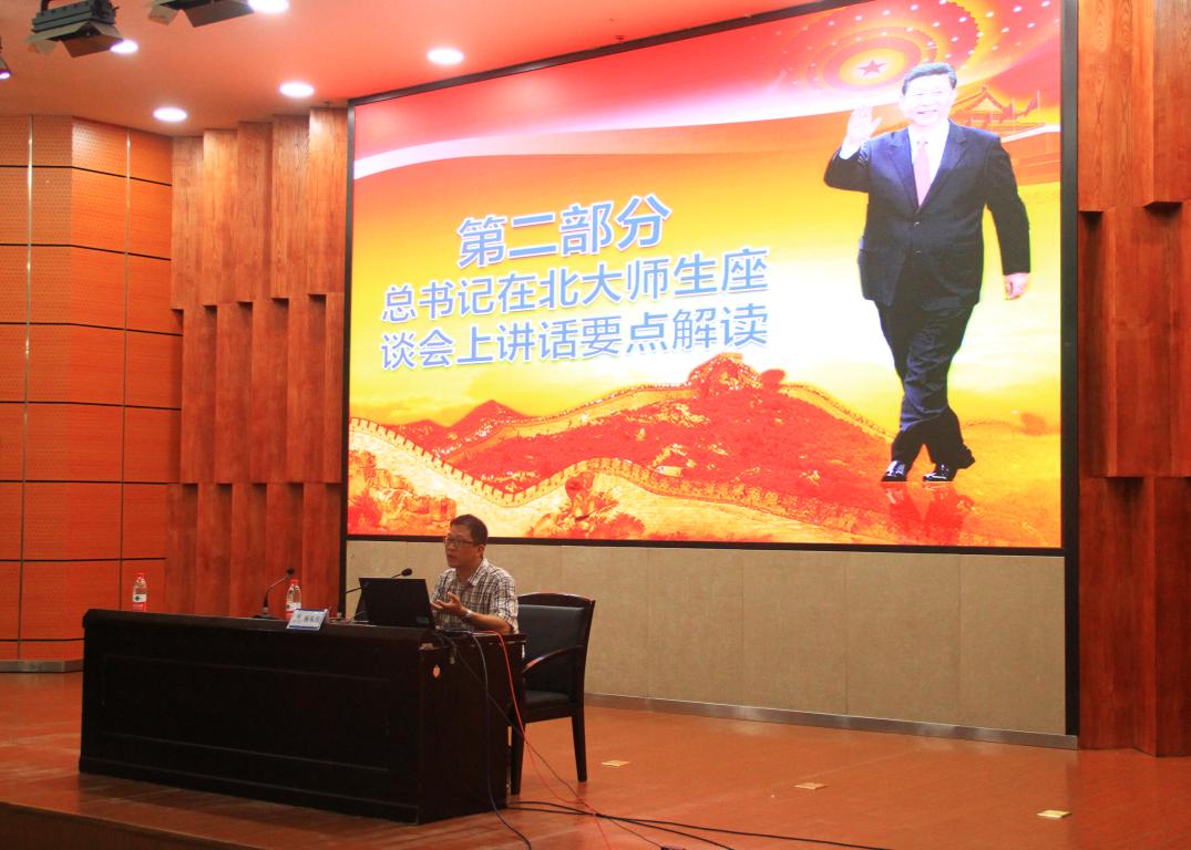 7月4日下午,皇冠博彩 在岩松堂雁山厅组织开展形势与政策课教学,学院党总支副书记杨振海为17级全体同学做“坚持立德树人培养时代青年 加快内涵发展建设高教强国——习近平总书记在北大师生座谈会上的讲话精神解读”报告。