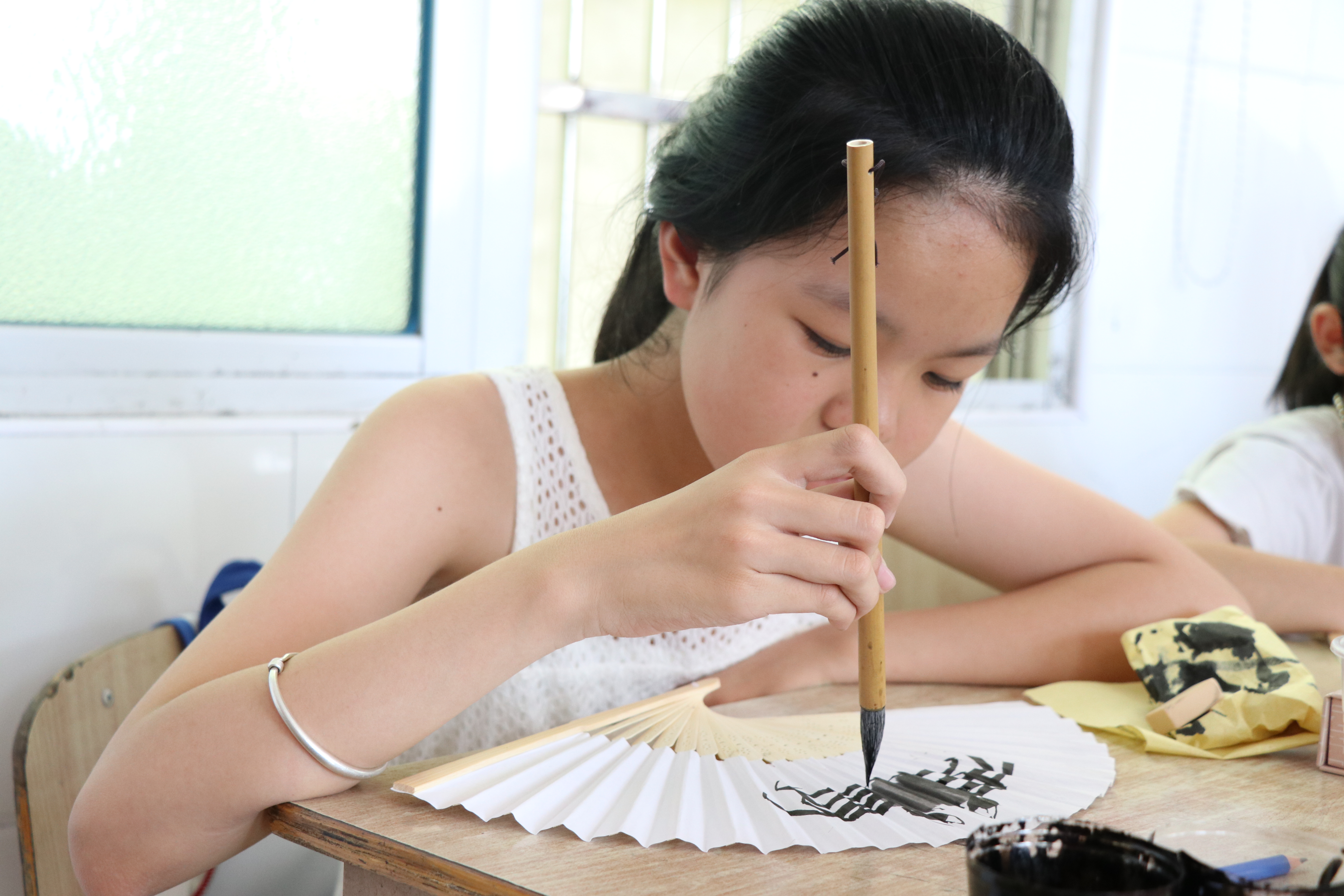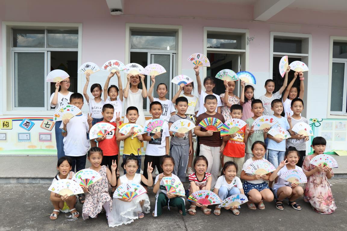 早上第一节课是朗诵课,绘暖向南实践队里正好有三位队员是来自于温州大学校院主持队。孩子们都是很优秀的可塑之才,在经过短短的讲解示范教学后,便已经读得有模有样了。我们请了好几位小朋友起来朗读,他们也配合积极,毫不吝啬地展现着自己。朗诵课后是书法课,由于孩子们年级段不同,所以特意安排了软笔书法与硬笔书法。低年级段孩子学硬笔书法,高年级段孩子学软笔书法。孩子们纷纷表示这是他们第一次尝试书法。我们告诉他们何事都有第一次,要勇于尝试。而他们的第一次书法也完成非常不错。从姿势到写字,都有模有样。而今日下午的扇上绘画是今日的重头戏,第一次的集体大活动,我们再一次把高低年级的小孩子聚集在一个教室里,像第一天他们刚来这里的时候一样,只是与第一天的不一样的是,孩子们和我们变得越来越熟悉了,脸上的笑容愈加灿烂。我们为他们准备好了扇子与画笔,让孩子们发挥想象在扇上绘画,孩子们一开始都不知道该如何下手,但是在最后他们给了我们大大的惊喜,每个人都在纸上表达了自己的奇思妙想,孩子们纯真的天马行空,绘画不失为一种完美的表达方式,这也启发了已经步入大学的我们。有时候天真无邪确实是弥足珍贵的。孩子们眼里的世界是五彩斑斓的,是一切皆有可能的。所以说保持初心是多么的重要。在这样的思考中,我们结束了今日的所有活动。