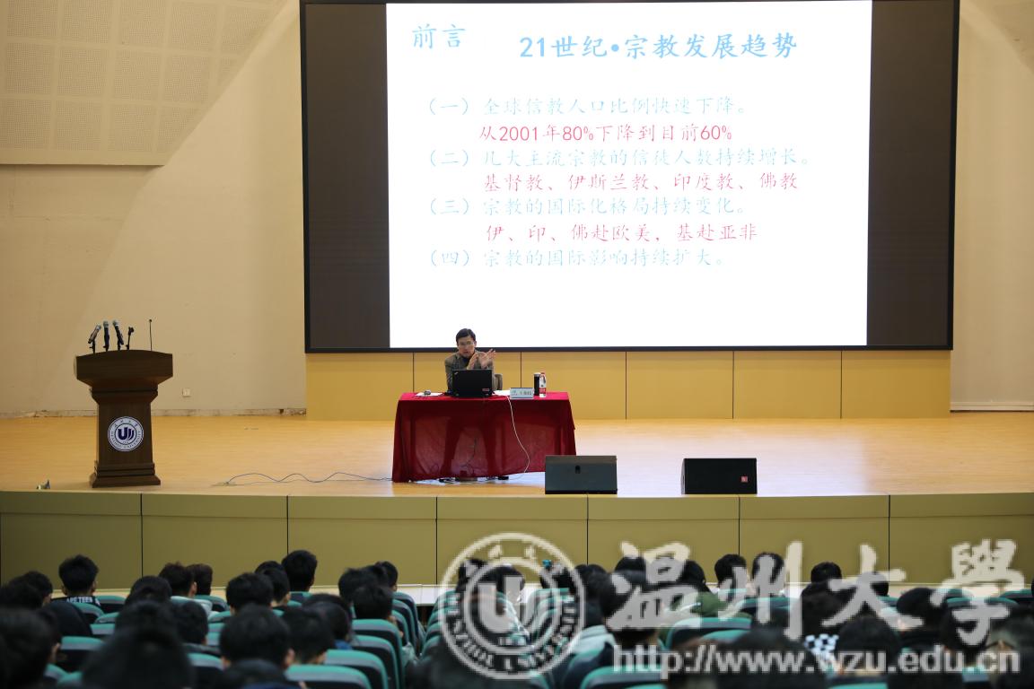 12月11日晚,本学期第一场形势与政策课讲座于南校9号楼报告厅举行。本次讲座邀请温州大学马克思主义学院党总支书记王柏民担任主讲。讲座内容为马克思主义宗教观的解读。 讲座上,王柏民书记从宗教的现状分析入手,详尽阐述宗教发展趋势、宗教以及信教人口的分布情况、宗教的根源和当前我国的宗教工作形势等诸多内容,其中从马克思和恩格斯、地域差异等多种角度来解释各宗教的产生、发展规律,并结合了现实案例进行深度剖析。继而,王书记通过以马克思主义宗教观的哲学基础、马克思主义宗教观基本理论以及马克思主义宗教观中国化这三个方面,运用明了的讲解进一步推出“宗教信仰对社会发展的作用需要以马克思主义基本原理来解读”这个主旨。其次,他提到,社会主义条件下宗教作为一种社会历史文化现象,它的长期存在是一种客观现实,不以人们的主观意志为转移。马克思的宗教观对于正确把握当代宗教的发展态势具有指导意义。宗教反映现实世界,宗教也是文化现象,应积极引导宗教与社会主义社会相适应,必须始终坚持中国化的方向。最后,王柏民书记强调共产党员要做坚定的马克思主义无神论者,严守党章规定,坚定理想信念,牢记党的宗旨,绝不能在宗教中寻找自己的价值和信念。