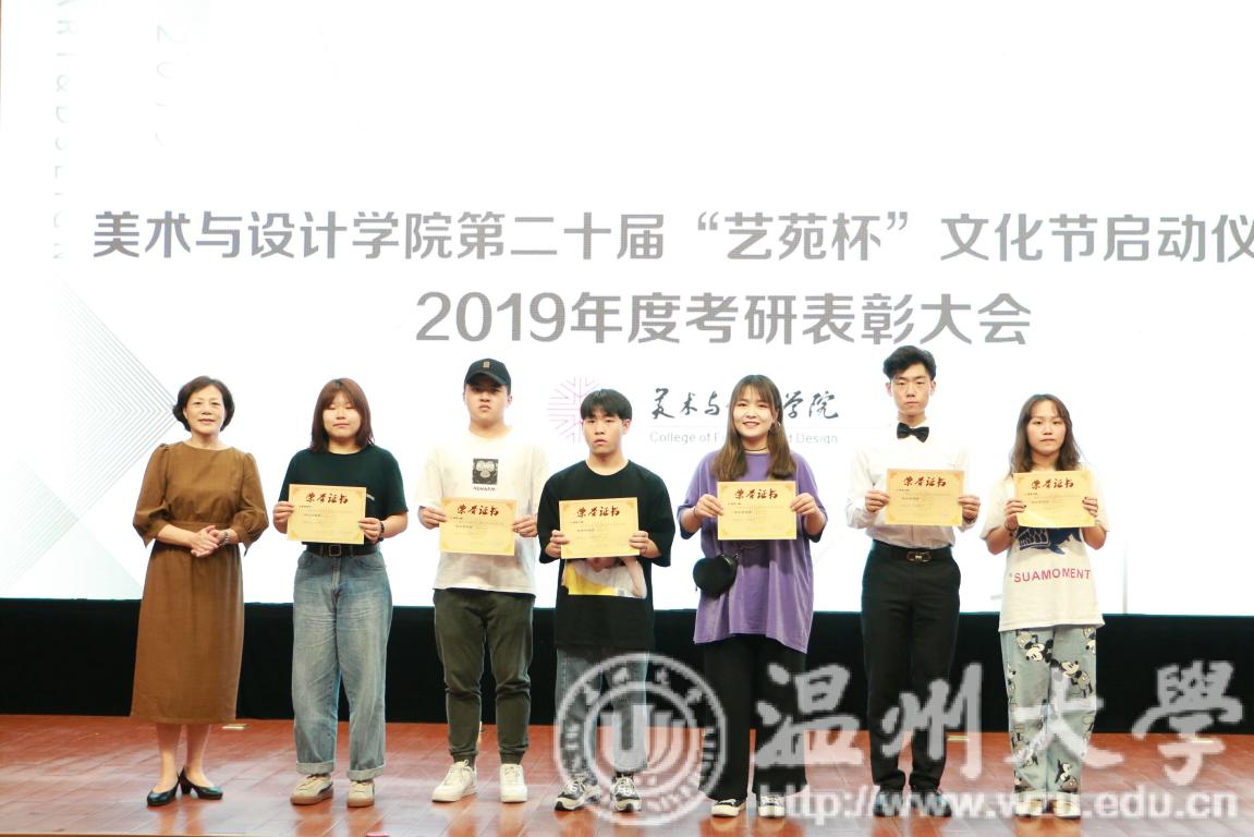 会议第二项议程是学风表彰。大会宣读了2018年度皇冠博彩 “五班十星”名单和2019年度皇冠博彩 “考研奖学金”获得者名单。2017-2018学年校级学习标兵陈晨,2019年度美院“考研奖学金”获得者代表15服工班杨怡洁、15美术学一班聂枭雄分别做学习和考研经验分享。2019年皇冠博彩 共有16人考取研究生,16人中有5人被浙江理工大学录取、6人被温州大学录取、1人被杭州师范大学录取,还有4人被国外的大学录取。与会领导为他们颁发了奖状和证书并合影留念。