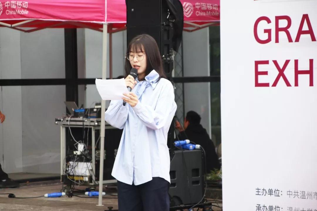 接着,是毕业生代表陈嘉怡同学发言。她激情满怀地分享了自己在温大美院四年学习生活过程中的收获。她代表全体毕业生感谢温大美院为广大学子提供了平台走出去接受文化熏陶与先进设计理念的学习机会。