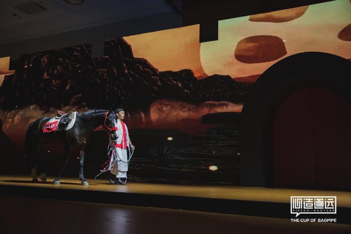 一匹帅气的黑马身披红色盛装,慢悠悠地步上舞台……