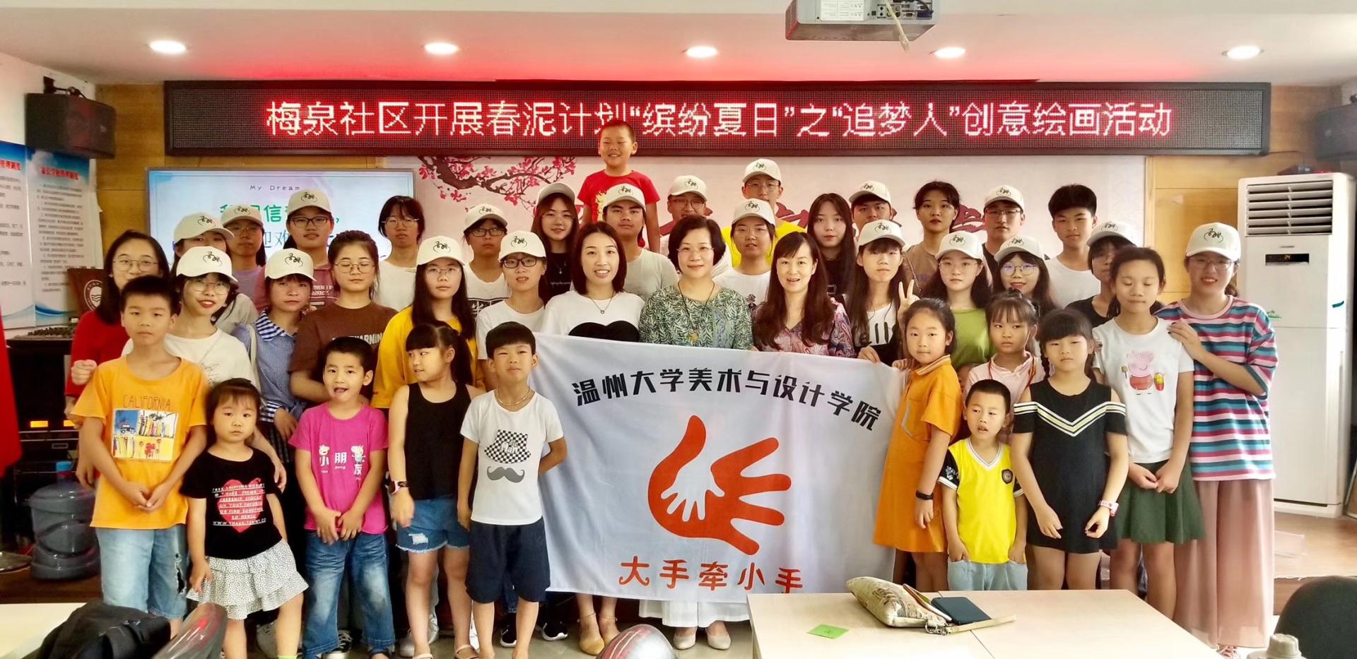 “大手牵小手”暑期社会实践队是一支由人文、化材、建工、数电、外语和美术等学院学生组成的暑期实践队,共有25名学生。该队伍致力于服务和关爱留守儿童和空巢老人,队伍通过探访,宣传,问卷调查以及支教等形式来开展社会实践活动。2019年7月16日上午9时许,温州大学美术学院院长谢子静、副书记杨丽君慰问了正在茶山街道梅泉社区开展活动的“大手牵小手”暑期社会实践队。