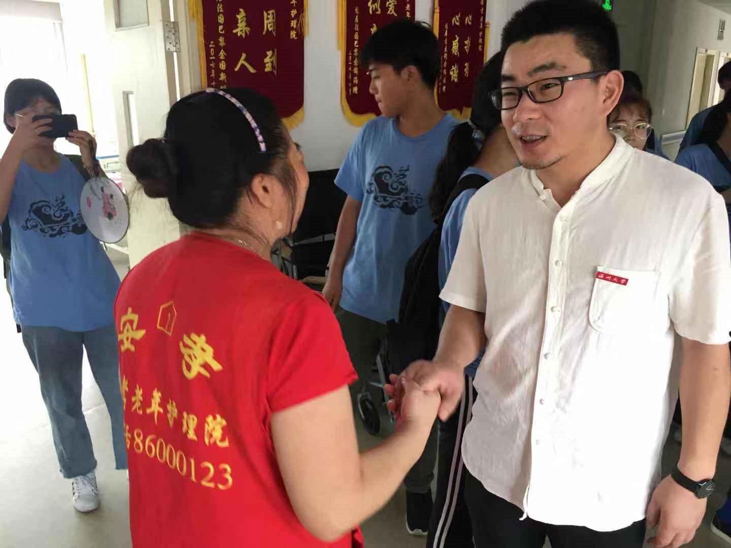 2019年7月18日上午九时许,皇冠博彩-博彩导航 副院长胡文超慰问了正在温州安孝老年护理院关爱老人活动的“艺韵晚霞”暑期社会实践队。初到敬老院,胡院长一行受到实践队员的热情欢迎,通过和队员们简单的交谈后,胡院长进入敬老院里,和敬老院里的护理人员详细了解敬老院的基本情况。