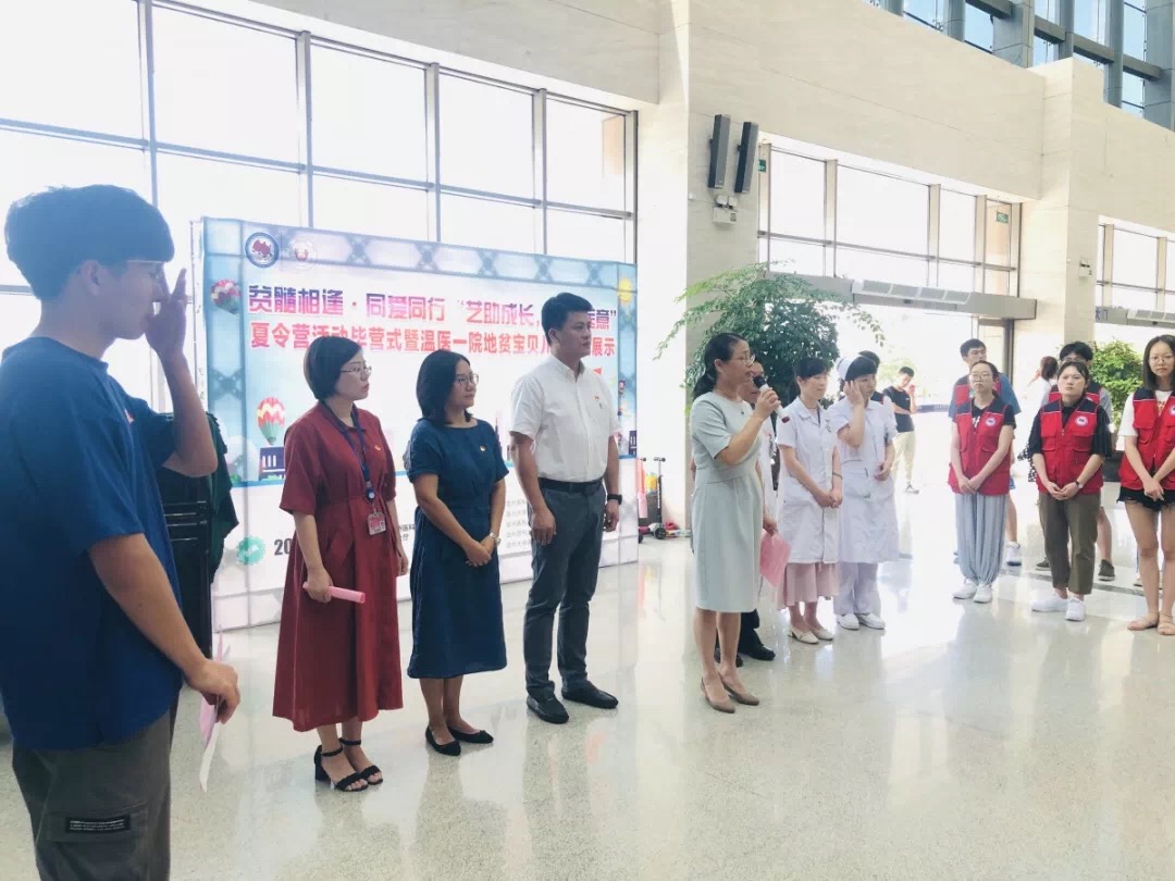 2019年7月23日上午,温州医科大学附属第一医院党委副书记金嵘;皇冠博彩-博彩导航 党委书记叶正飞;温州医科大学附属第一医院血液内科主任俞康;温州医科大学附属第一医院血液内科副主任、阳光地贫志愿队队长陈怡;温州医科大学附属第一医院团委专职副书记尚蕾蕾;皇冠博彩-博彩导航 学工办主任杨鹏;皇冠博彩-博彩导航 辅导员等人来到温州医科大学附属第一医院南大厅参加了“贫髓相逢 同爱同行”夏令营闭营仪式。