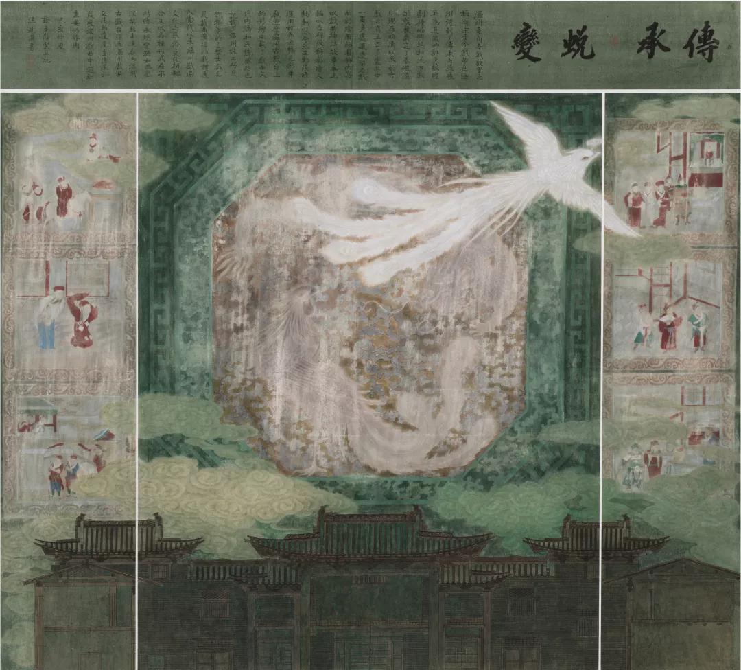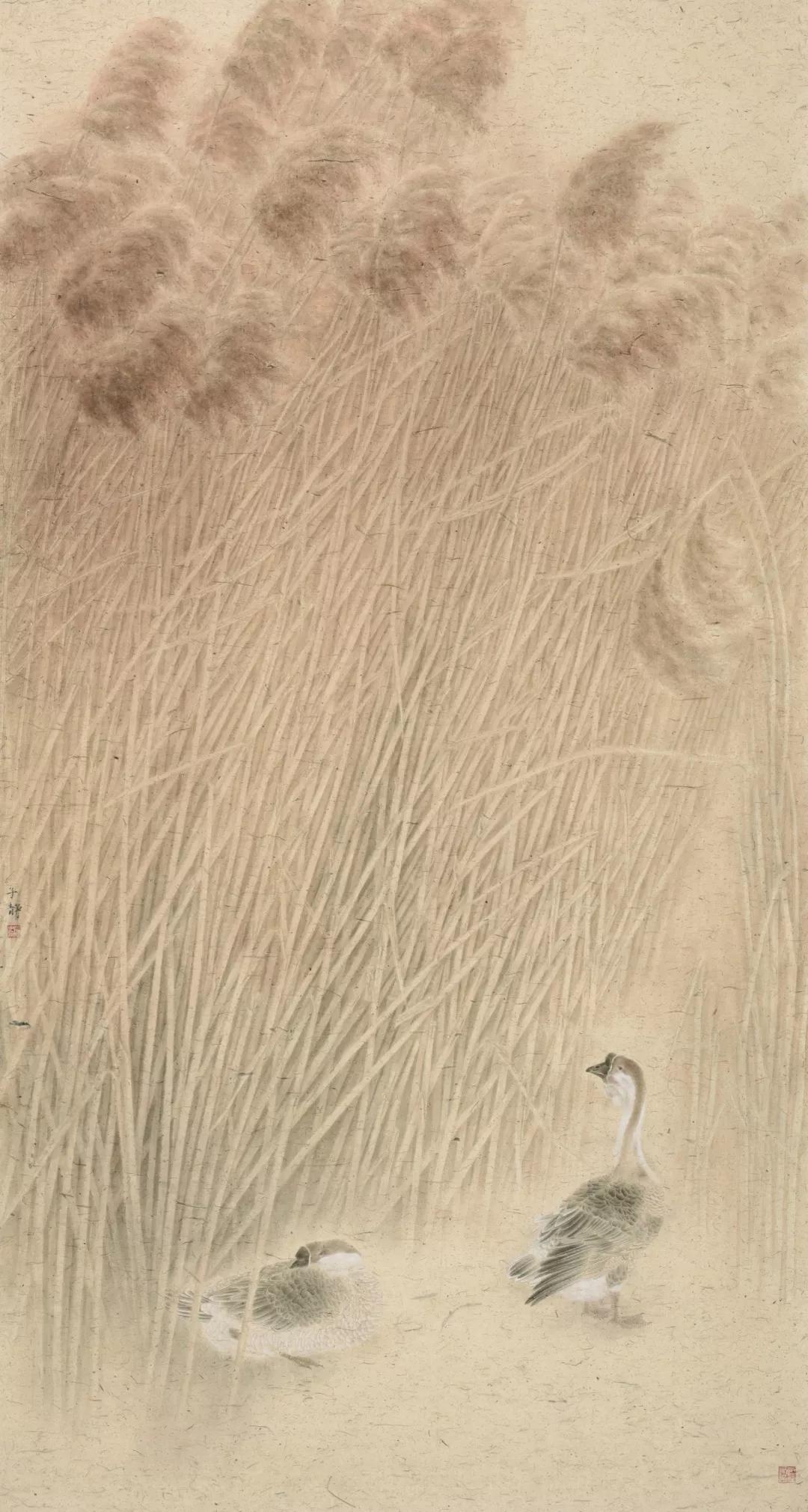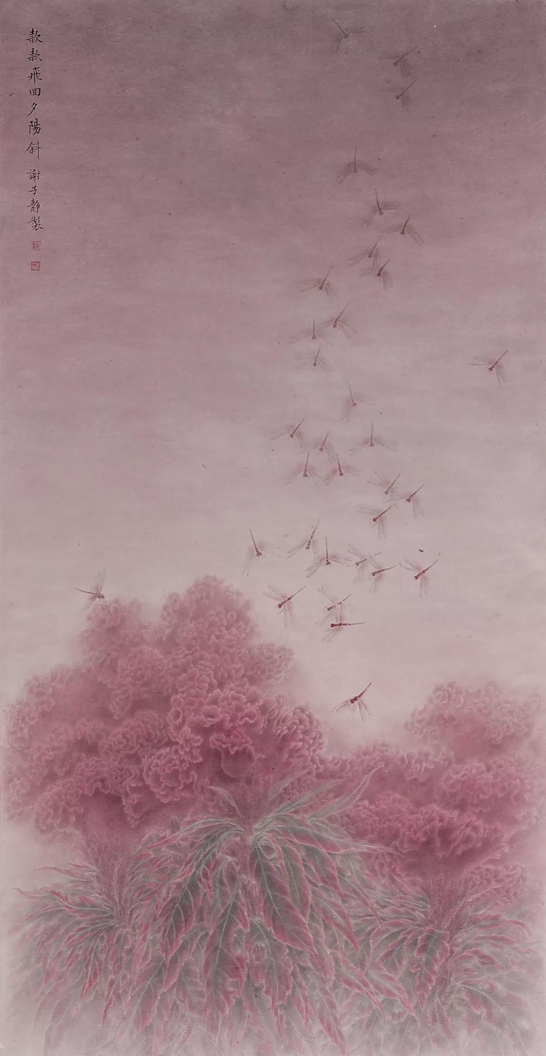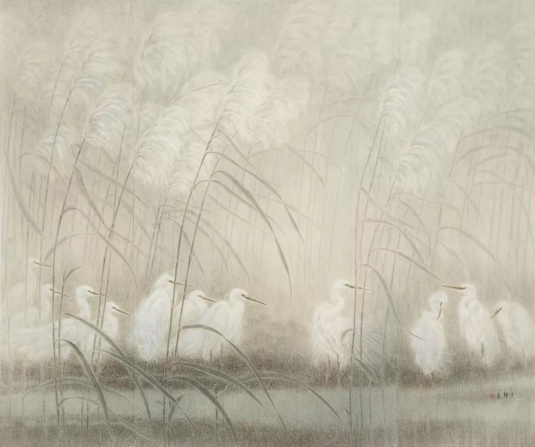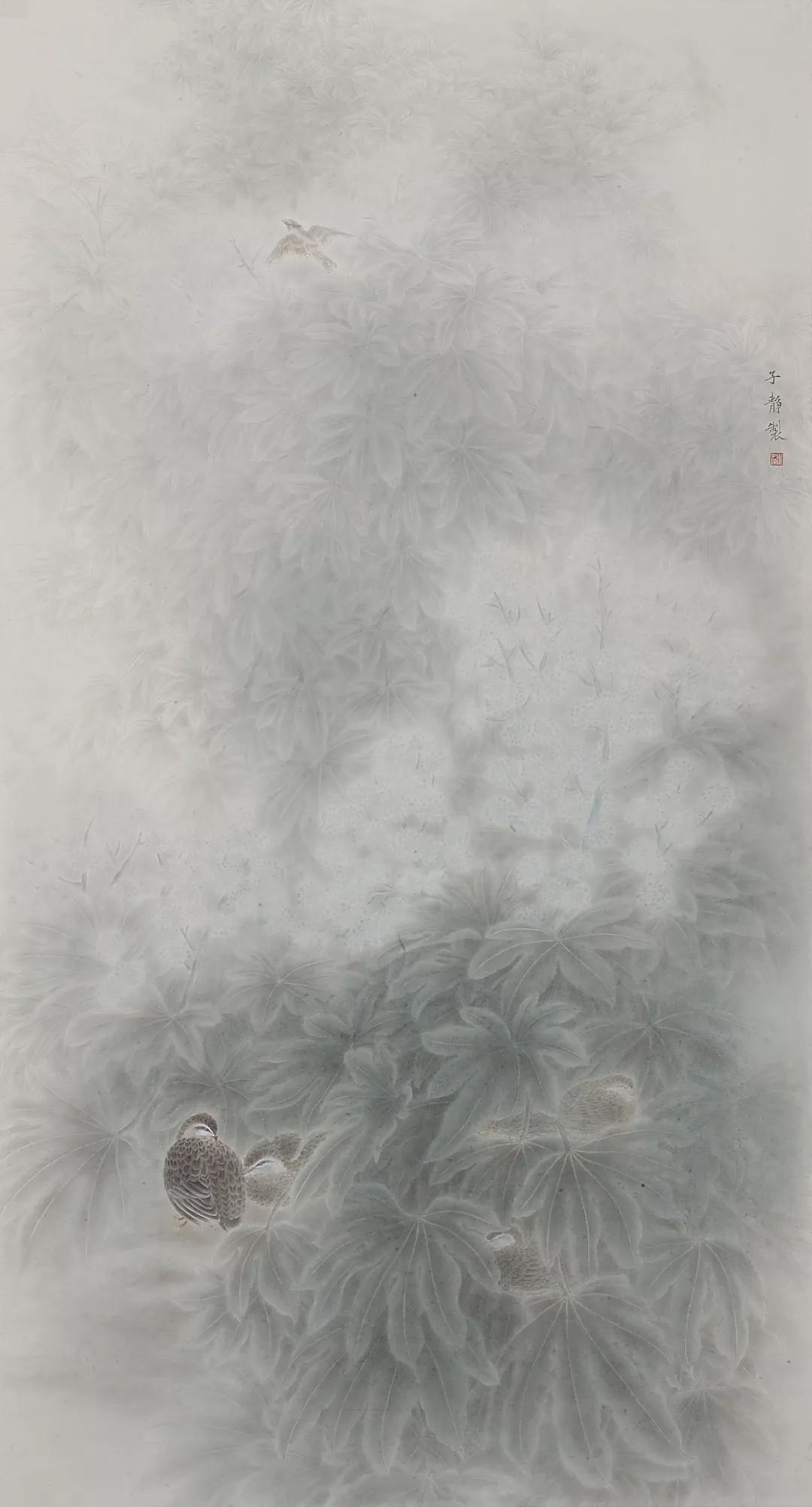 谢子静的作品以恬静、典雅、淳朴、淡泊为主旋律,而积极向上,热情乐观则是作品精神的内涵。在立意造景方面,看似寻常,但却能给人以无限遐想。如《秋露》图,画面右侧,一株强劲有力的剑麻直线挺然而立,远处数株风姿自然,并巧布在画面右侧以曲线多变的外形,构成一大空白。空白的一侧,隐藏着两只相依的禽鸟,使画面别开生面,既增添了联想的空间,又活跃了画面的气氛。意的妙趣,情的缠绵,赏之有回味,读之有余音。这种寻常的造景立意,能取得如此的艺术魅力,全在思维的敏捷,想象的豁达,虚实的巧布,笔墨的机灵。在构成布置方面,虽无惊险奇特之举,然而能让人感到平中有变、平中藏奇的感受。如《青剑》图,几株茁壮的剑麻平行直线排列,几只蜻蜓横向飞行,从画面构成来看,是一幅极为简单的纵横直线相交组合。由于平行中有耐人寻味的变化,交叉中有捉摸不定的穿插,在不经意中把那种朴实、纯洁、天然、自在的艺术情味表现得十分得体,给人以辽阔、深远、新奇、大气的美感。在设色方面,很少采用强烈夺目绚丽的色彩,而是以清淡典雅作为基调,于淡中求变化,淡中求韵味。刻意追求物象神质情态的表现,以达到最强度的艺术感染力。如《蒹葭苍苍》图,作品以平日里采风、写生途中所见的芦苇与嬉栖的白鹭为画材,旨在表现自然界动人和谐的一幕,寄寓着摆脱尘俗,融入超逸的自然景界,抒发了一种美好的心境。画风以宋明院体花鸟画之雍容谨严为典范,参以文人画逸笔的幽远意境与简澹设色,营造画者心中氤氲已久的古典幽梦。篇幅宏阔,意在改变历代花鸟画常见的小品格局,赋予作品以富有张力的现代视觉形式效果。如《荷风送香》图,整幅画面如同一曲抒情的轻音乐,使人沉浸而陶醉。青绿色的荷叶,在淡泊中见有沉甸厚重之感,叶面周边施以淡赭,不仅取得温柔的冷暖对比效果,也把荷叶的生态美表现得鲜活纯真。白色的荷花,着粉不滞板,恰到好处,把花瓣沉稳而透亮的质感表现得极为优美。月黄的莲蓬更是意气妖态,飘飘然而欲舞,默默然若移步,似有清香袭人,如临野塘晨风,水天一色,花草和谐,赏之悦目,,读之心怡。这种境界正是谢子静匠心用色所追求的艺术情趣。《传承.蜕变》是谢子静近期的创作作品,画面表现的是温州古戏台的一组组戏曲彩绘图饰,辅以吉祥纹饰。彩绘人物动态夸张、生动,线条运用娴熟、流畅,色彩斑驳、厚重,以传统的工笔重彩技法记载了温州戏曲文化与民俗文化。作者正以其特有的视角和方式关注温州戏曲文化遗产,倡导温州南戏的传承与蜕变。更有得一之想的是画面以一只飞鸟置于前景,将不同时期舞台的图饰作为背景,达到穿越时空的联想。以花鸟画的形式来表达戏曲的题材内容可能当属首次,这充分说明作者对事物观察的敏锐性和大胆创意的精神,关注其传承与蜕变。