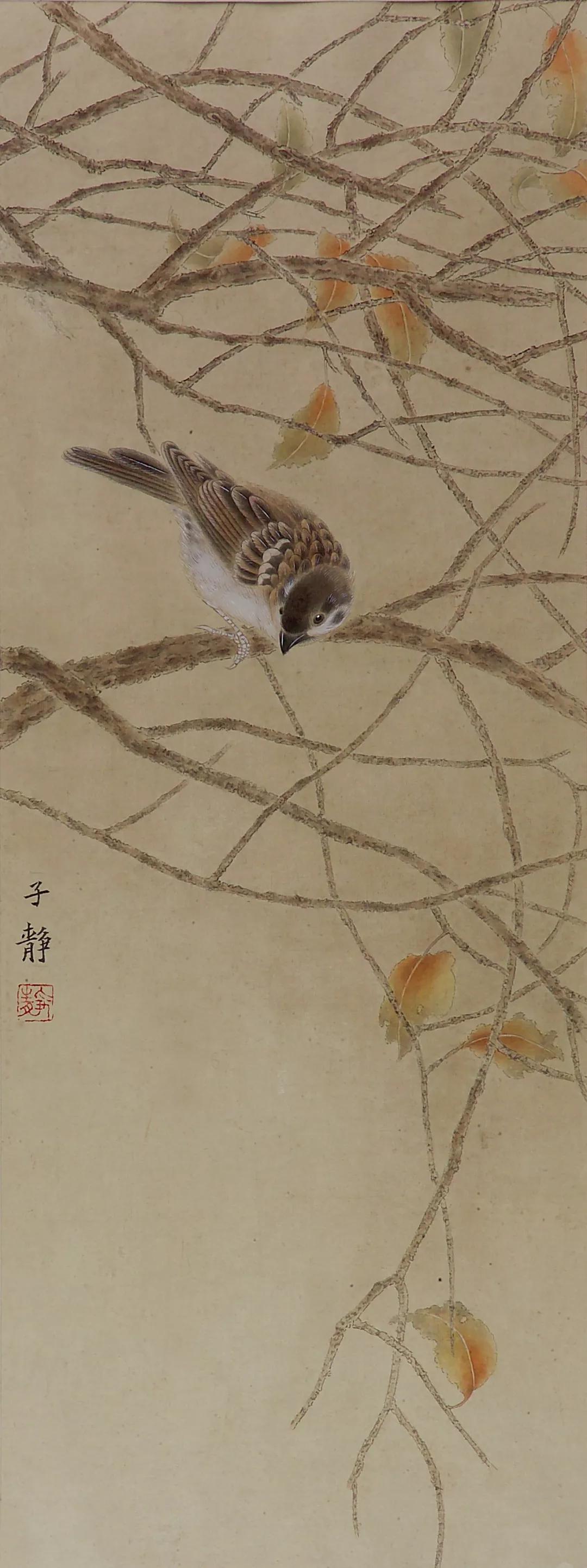 谢子静专攻中国花鸟画,对大自然的一花一鸟,一草一石均投以极大的热情与兴趣。她时时被这些物件的优美情态所感染,情急之下便命笔记写,反复品味,不断揣摩,并联想前人的艺术表现,使这些生动可爱的对象,升华为初步的艺术形象存记于脑海之中,这为她的艺术创作提供了丰富的自然原始素材。平时,除了虚心跟随名家学习外,还十分重视研习前人的传统艺术表现方法,尤其是宋人的花鸟画,使她产生了浓厚的兴趣。在临摹经典作品时,不仅力求神貌皆合,并把精力集中在探讨其原因、寻找其规律、挖掘其奥妙之上。从取材、构图、创意、表达等多方位加以硏究,常常以一个探宝者的心境去逐一玩味,直到有所领悟。这种科学而严谨的治学态度,奠定了创作的坚实基础。