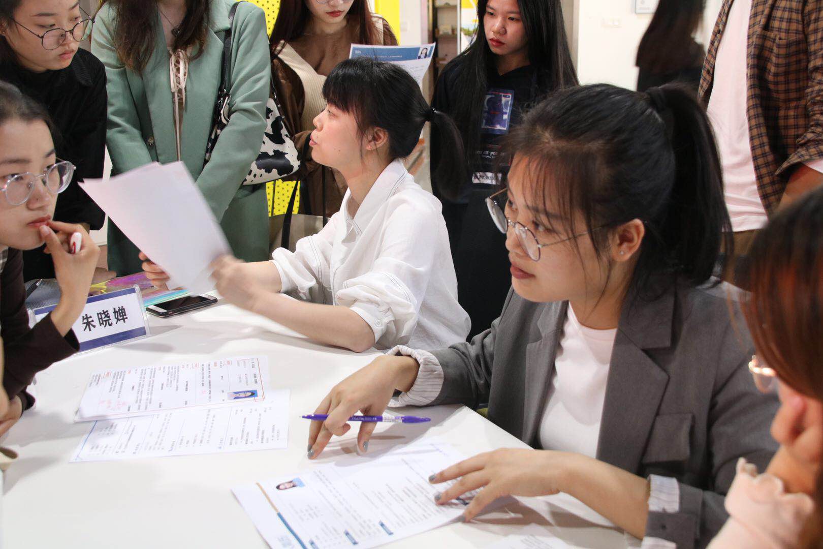 活动刚开始,大家准时到达活动场地进行准备工作,杨鹏老师热情地与同学们分享经验,大家积极有序地进行提问,相互讨论,会场气氛非常活跃。两位XG服饰的HR朱到场后,同学们纷纷拿出自己准备好的简历向她们请教,两位HR针对同学们不同的专业分别进行简历指导。大多数同学的疑问是:简历中需不需要有自己实习期间的照片之类的资料。面对即将步入职场并为此感到迷茫的同学,老师们认为大学期间的实习及从业经历可以加入简历,并建议在简历中强调与面试职位相关的实习经历。