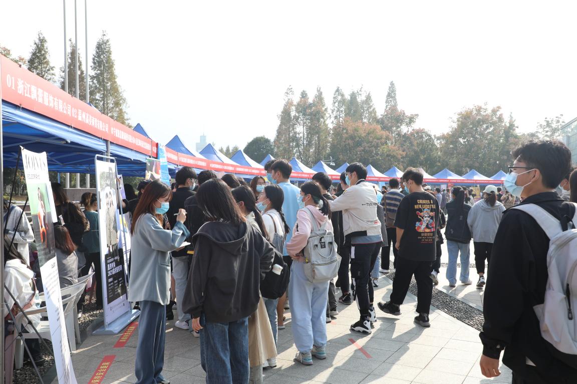 2020年11月8日下午,皇冠博彩 2021届毕业生专场招聘会于大学生活动中心广场顺利举办。招聘会上,来自上海、杭州、宁波、台州、嘉兴等地区的64家单位,携2000余个岗位广揽英才,吸引了服装、设计、美术等校内外近千人才参加,其中温州大学瓯江学院艺术设计分院、在温高职院校相关专业毕业生到会参与,场面热闹而有序。
