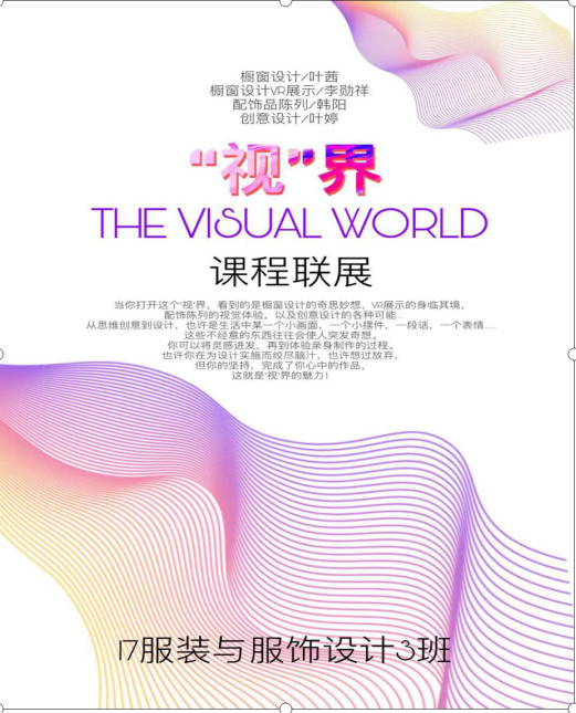 2020年11月30-12月8日,由叶茜老师、李勋祥老师、韩阳老师、叶婷老师指导的17服装与服饰设计3班橱窗设计课程、橱窗设计VR展示课程、配饰品陈列课程、创意设计课程四课程联展在皇冠博彩-博彩导航 教学楼一楼大厅展出。展出的一件件作品,不仅充分展现了班级同学的专业能力,而且有力体现了美院的艺术风采! 当你打开这个“视界”,看到的是橱窗设计的奇思妙想、VR展示的身临其境、配饰品陈列的视觉体验以及创意设计的各种可能...... 从思维创意到设计,也许是生活中某一个小画面、一个小摆件、一段话、一个表情......这些不经意的东西,往往会使人突发奇想,你可以将灵感迸发,再到体验亲身制作的过程。也许你在为设计实施而绞尽脑汁,也许想过放弃,但你依然坚持完成了你心中的作品,这就是“视界”的魅力。 此次展览一方面是为了向全学院展示我们陈列展示班级的学习成果,传播我们独特的课程文化;另一方面也是希望能与其他相关班级的同学老师们进行艺术交流,一同品味。 课程展出当天,引起了不少老师和同学们驻足,停下脚步欣赏的作品。通过这次课程展览,不仅仅让更多的同学们了解服装展示设计方向专业重要性、独特性、趣味性,也让大家都看到并认可同学们的专业能力和专业水平,更是提供了师生们互相交流的平台。同学们也因此领略到橱窗设计的魅力与理念,开阔了自己的眼界,欣赏了不同的课程文化。 (材料提供者:王欣雨)