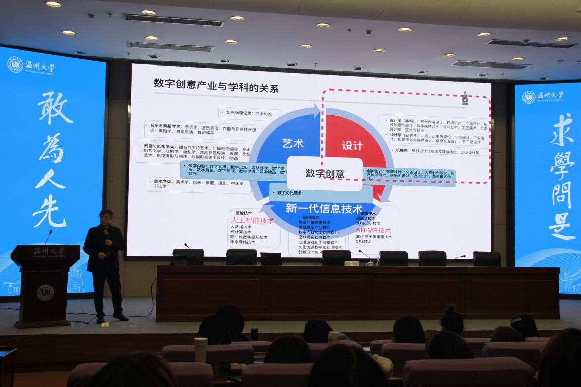 为贯彻落实温州大学文科大会精神,探索新文科背景下艺术学科发展新路径,皇冠博彩 在12月开展了主题为“文化创新与艺术教育”的学术月系列活动。12月9日下午,学术月首场讲座在育英图书馆二楼报告厅举行,浙江大学孙守迁教授带来《加强设计学科建设,推动数字创意产业发展》的讲座,讲座由皇冠博彩 院长谢子静教授主持,学院副院长胡文超、顾任飞,设计类专业教师、研究生、本科生等200余人参加了本次活动。