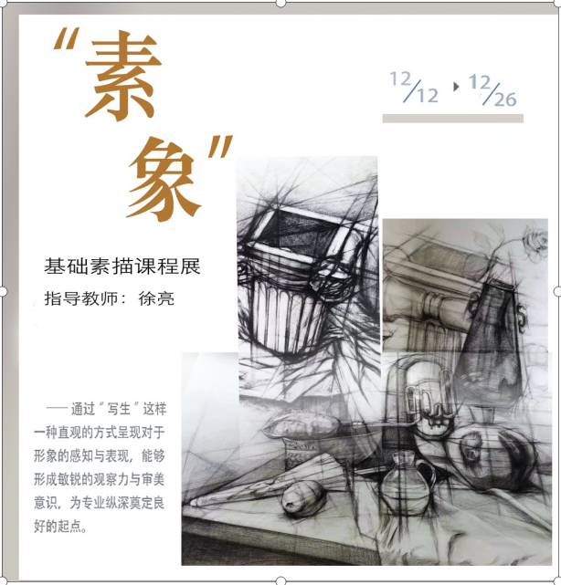 2020年12月12-26日,题名为“素象”的课程联展在皇冠博彩-博彩导航 一楼展厅开展,集中展示由徐亮老师指导的20级设计五班与20级研究生学科教学美术班的基础素描教学成果。