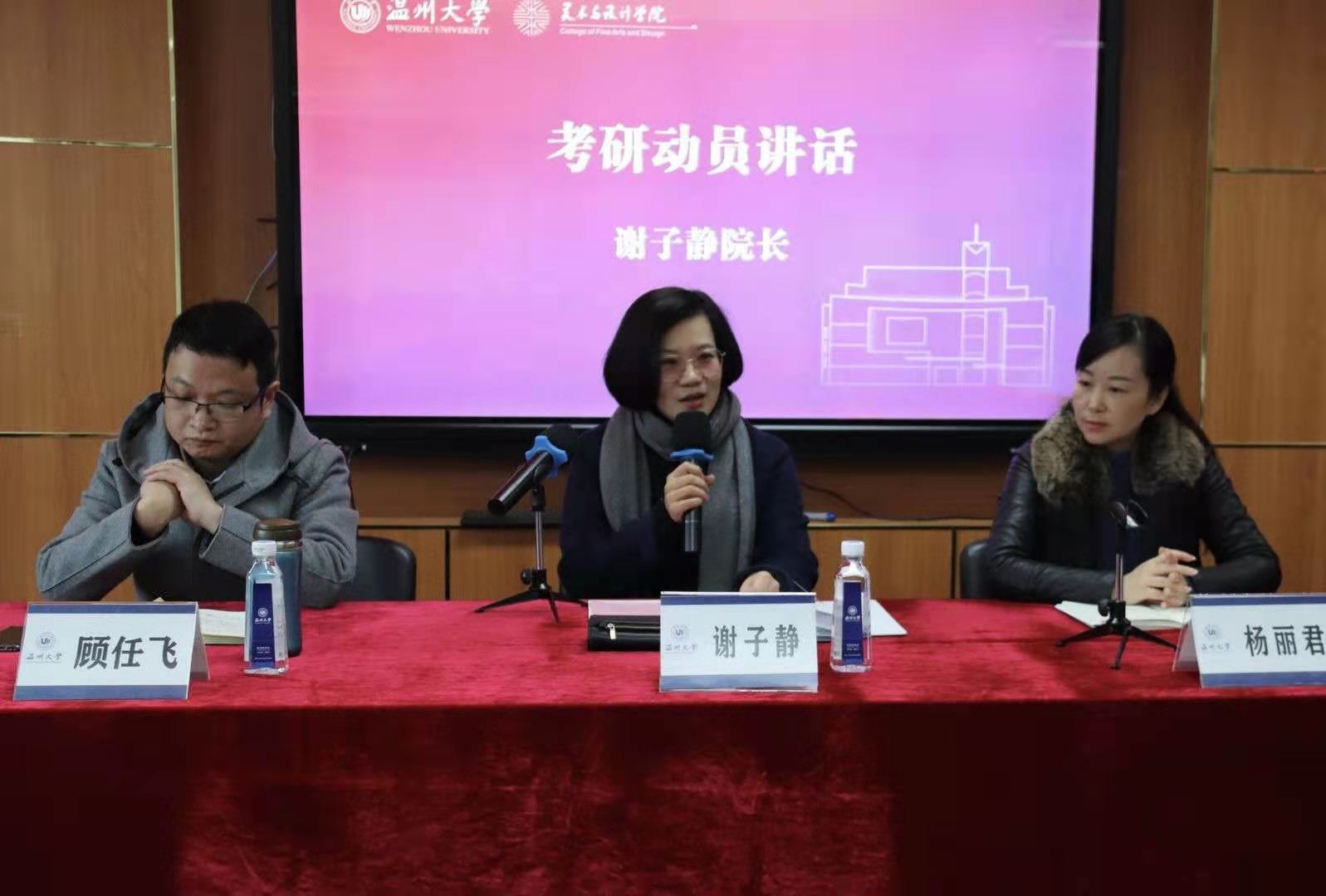 2020年12月16日下午14点,皇冠博彩-博彩导航 2018级考研动员服务月暨“艺·研·帮”系列活动启动仪式在美院综合楼2b4001顺利开展。出席本次活动的嘉宾有院长谢子静、党委副书记杨丽君、副院长顾任飞、学工办老师以及2018级考研学生代表,活动由美院党委副书记杨丽君老师进行主持。此次动员大会旨在指导学生如何在考研前做好充足的准备,在未来更好地发展。