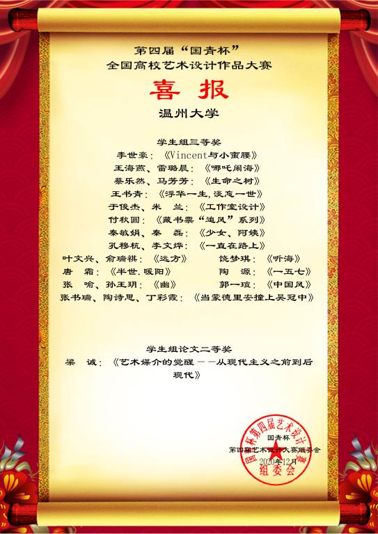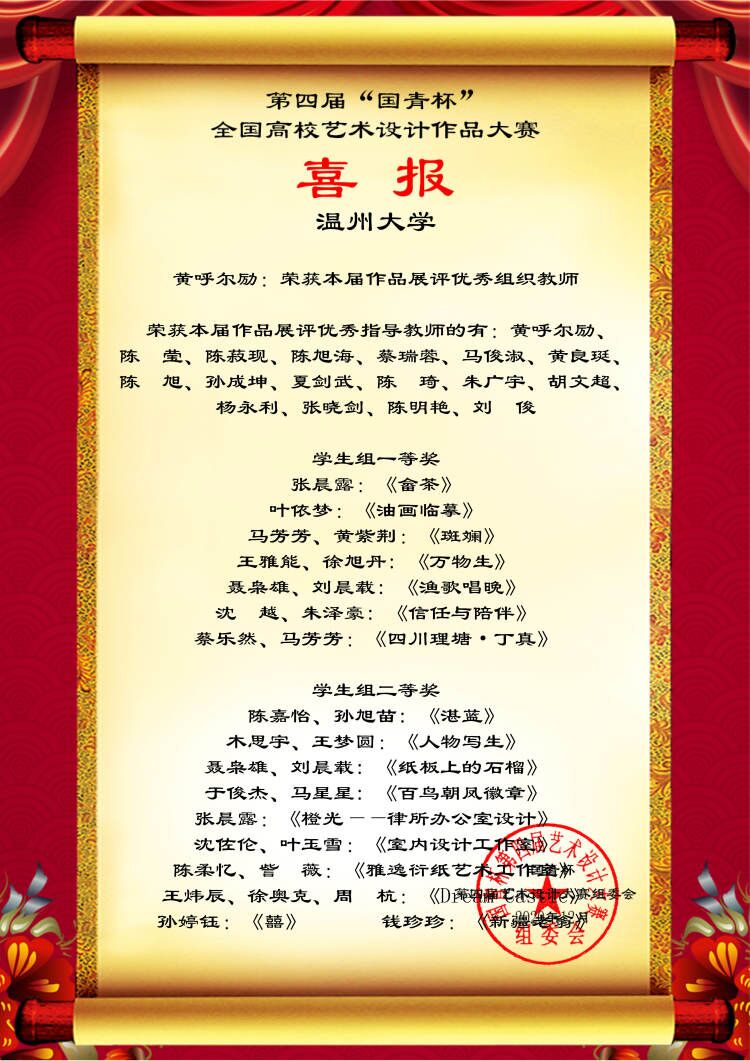 近日,皇冠博彩 师生在第四届“国青杯”全国高校艺术与设计作品展评大赛中共计33项作品获奖,其中马芳芳等7名同学获得“学生组一等奖”、钱珍珍等10名同学获得“学生组二等奖”、李世号等15名同学获得“学生组三等奖”,、梁诚同学获得“学生组论文二等奖”。此外,陈莹等17名老师还获得组委会颁发的“优秀指导教师奖”,成绩喜人。