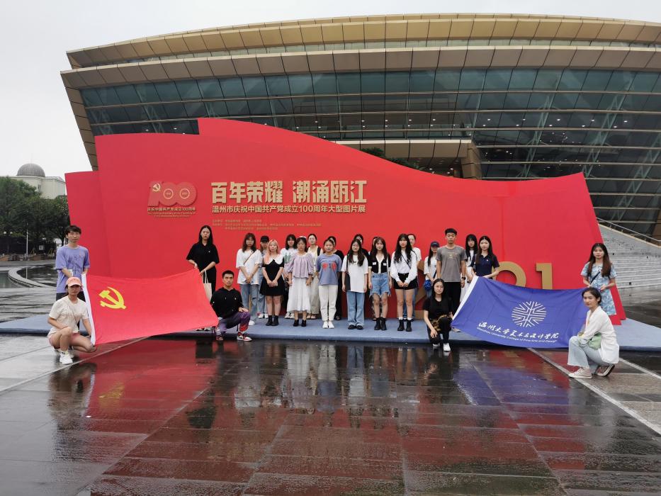 6月27日下午,皇冠博彩 学生党支部赴温州大剧院参观“百年荣耀·潮涌瓯江”温州市庆祝建党100周年大型图片展,开展主题党日活动。本次主题党日活动围绕“宣誓”、“观影”、“参观”三个环节开展。在主题党日活动室,在支部书记汪成龙的带领下,党员们面对党旗整齐列队,高举右手,重温入党誓词。宣誓完毕后,同学们依次坐下观看影片,影片中播放着革命先烈们英勇抗争的事迹,一幕幕悲壮的场景,让同学们对于担当使命,不怕牺牲、英勇斗争,对党忠诚的伟大建党精神有了更深刻的了解。