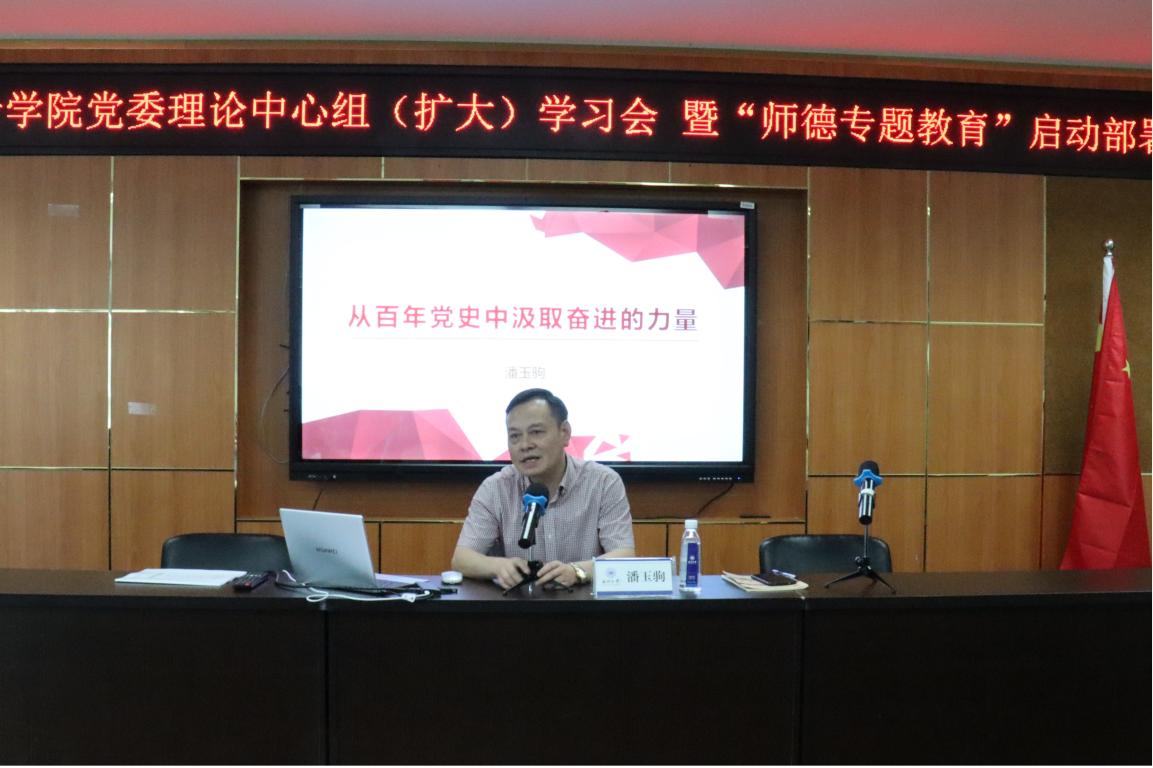 6月16日下午,校党委委员、宣传部部长潘玉驹教授以《从百年党史中汲取奋进的力量》为题为皇冠博彩 师生党员上专题党课。潘委员从中华民族的历史史册开篇,带我们重温半条棉被、抗日英雄杨靖宇等党史故事,回顾中国共产党传奇的建党历程,指出我们党的光辉百年,是矢志践行初心使命的一百年、是筚路蓝缕奠基立业的一百年、是创造辉煌开辟未来的一百年。潘委员强调,中国特色社会主义进入新时代,中华民族伟大复兴曙光在前、前途光明,但也面临着严峻挑战,在这个关键当口,全体师生要以史为镜、以史明志,增强历史自觉,激发为实现中华民族伟大复兴而奋斗的信心和动力,做到“六个进步”,以昂扬姿态奋力开启全面建设社会主义现代化国家新征程,以优异成绩迎接建党一百周年!