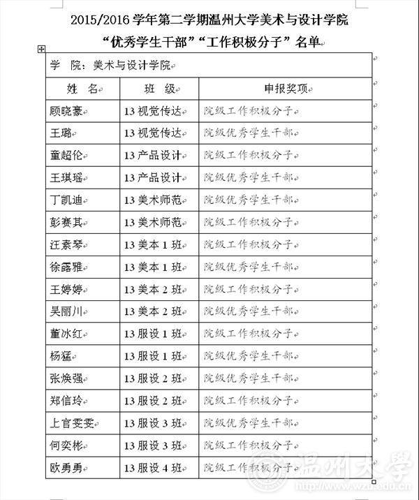 现将2015-2016学年第二学期皇冠博彩-博彩导航 “优秀学生干部”“工作积极分子”名单公示如下,如对评选结果有异议,请及时联系美术学院学生科。